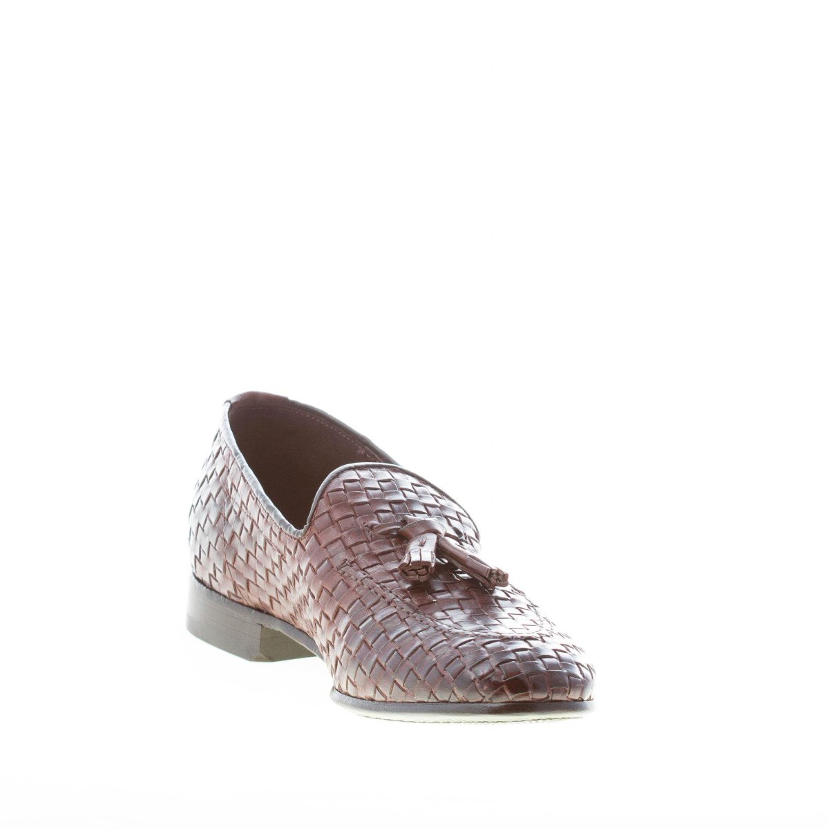 Mocassino accollato in pelle a lavorazione intrecciata testa di moro con nappine. Lavorazione artigianale. Cucitura a vaschetta sulla punta. Suola in cuoio.