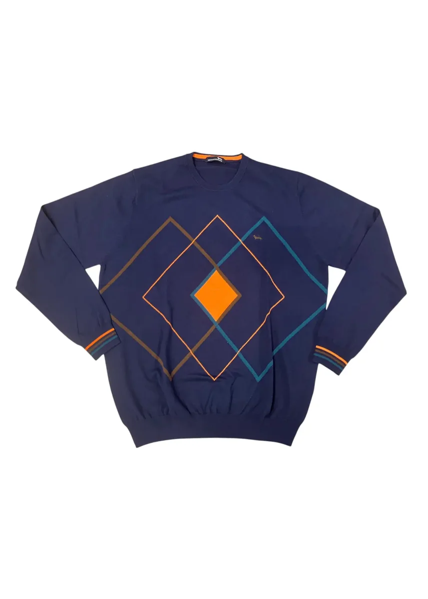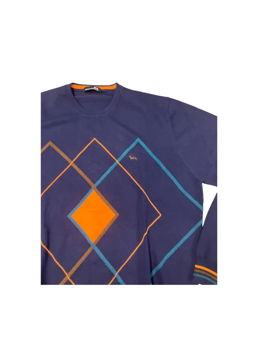 60% cotone e 40% lana multicolore a fondo blu scuro. Fantasia rombi multicolore. Vestibilità regolare classica. Articolo HRM6590307