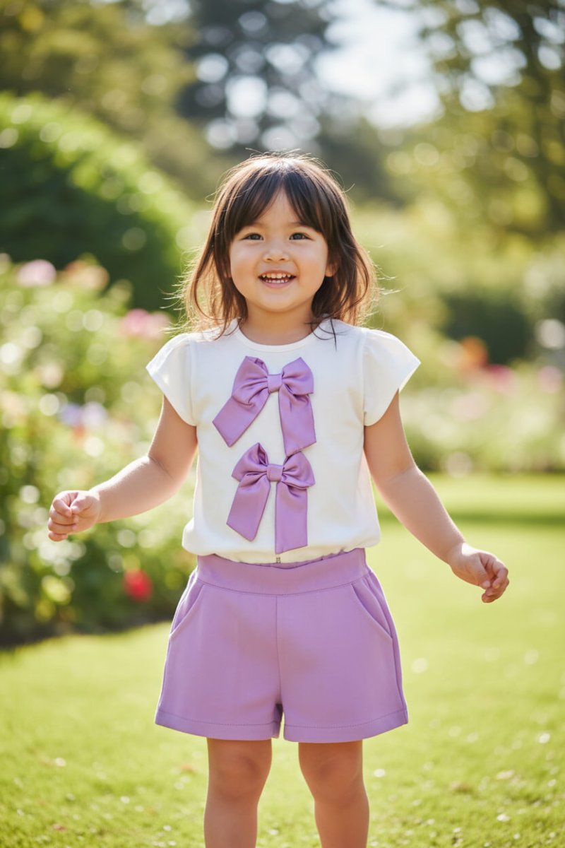 Un completo tenero e raffinato, perfetto per occasioni speciali o per un look chic e curato. La magliettina bianca a maniche corte รจ impreziosita da due maxi fiocchi lilla applicati sul davanti, che donano un tocco romantico e irresistibile.