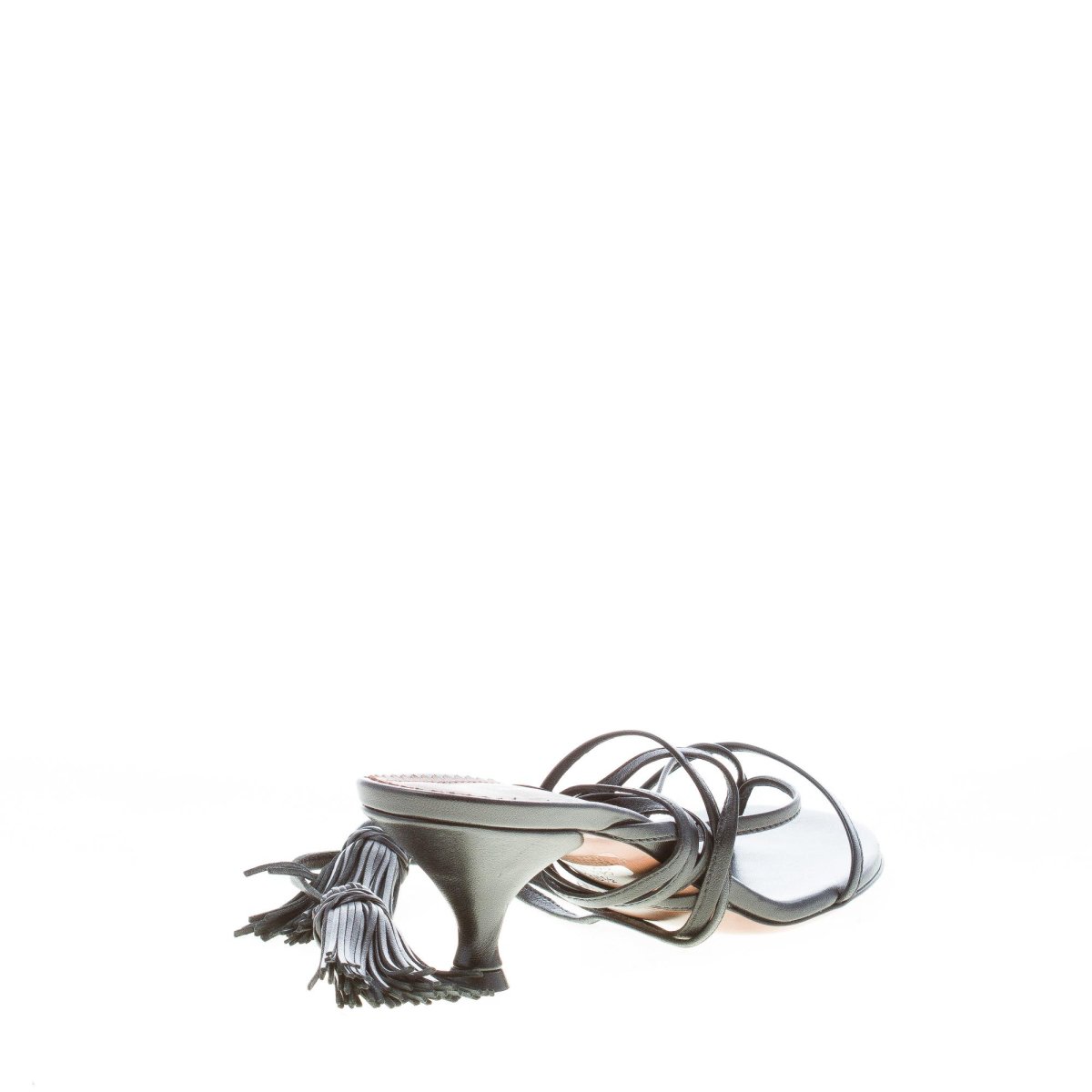 L’AUTRE CHOSE donna sandalo infradito in pelle NERO con laccio alla caviglia e nappe. Tacco 5 cm