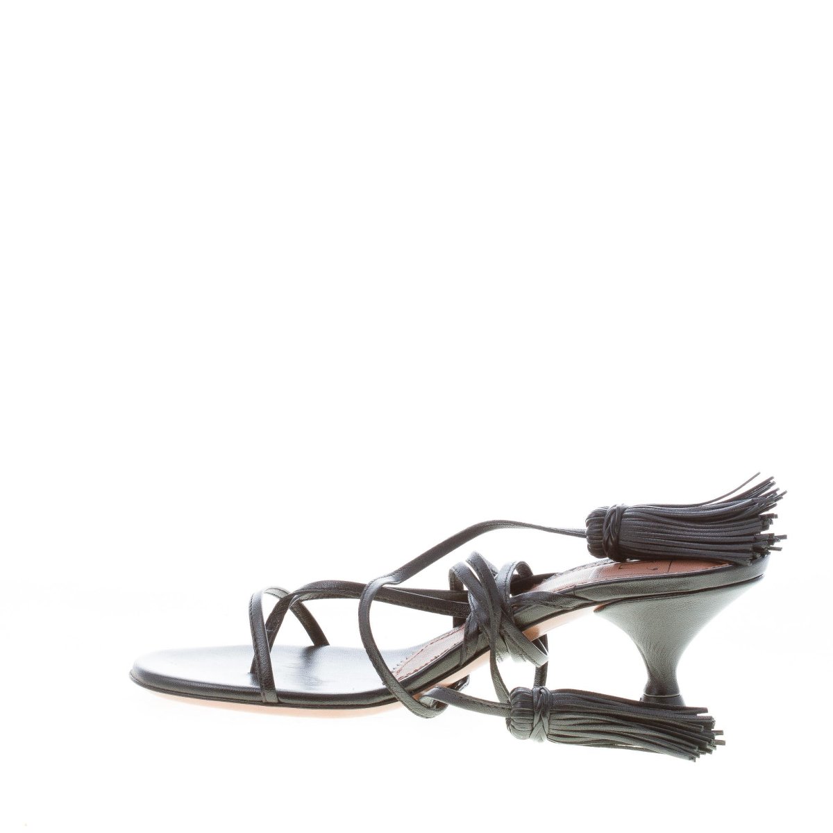 Black soft napa leather thong sandal with an open toe thin strap and a long ankle strap with decorative tassels. Leather sole. Heel 5 cm