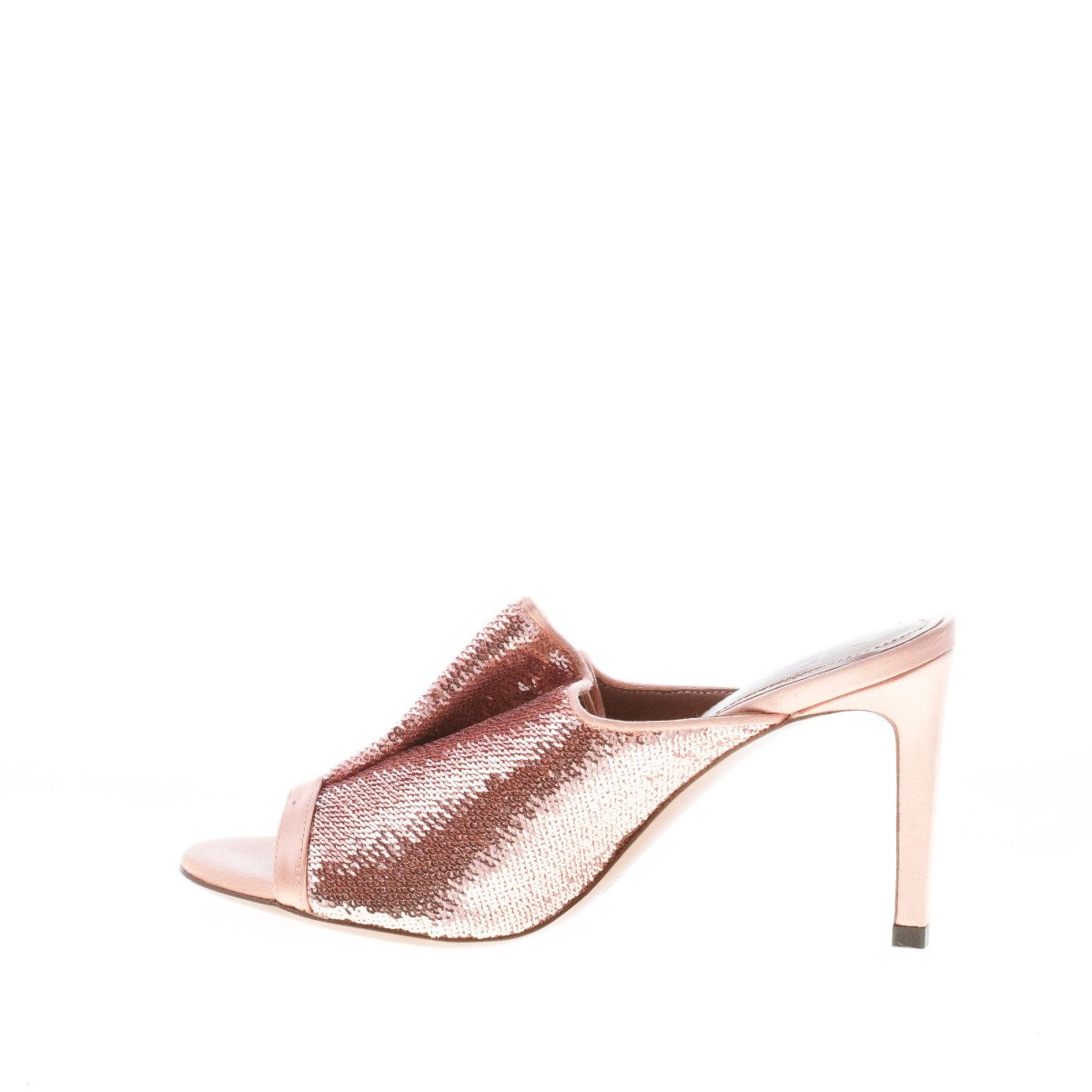 L’AUTRE CHOSE donna sandalo slide in tessuto e raso ROSA con fascia e paillettes. Tacco 8,5 cm