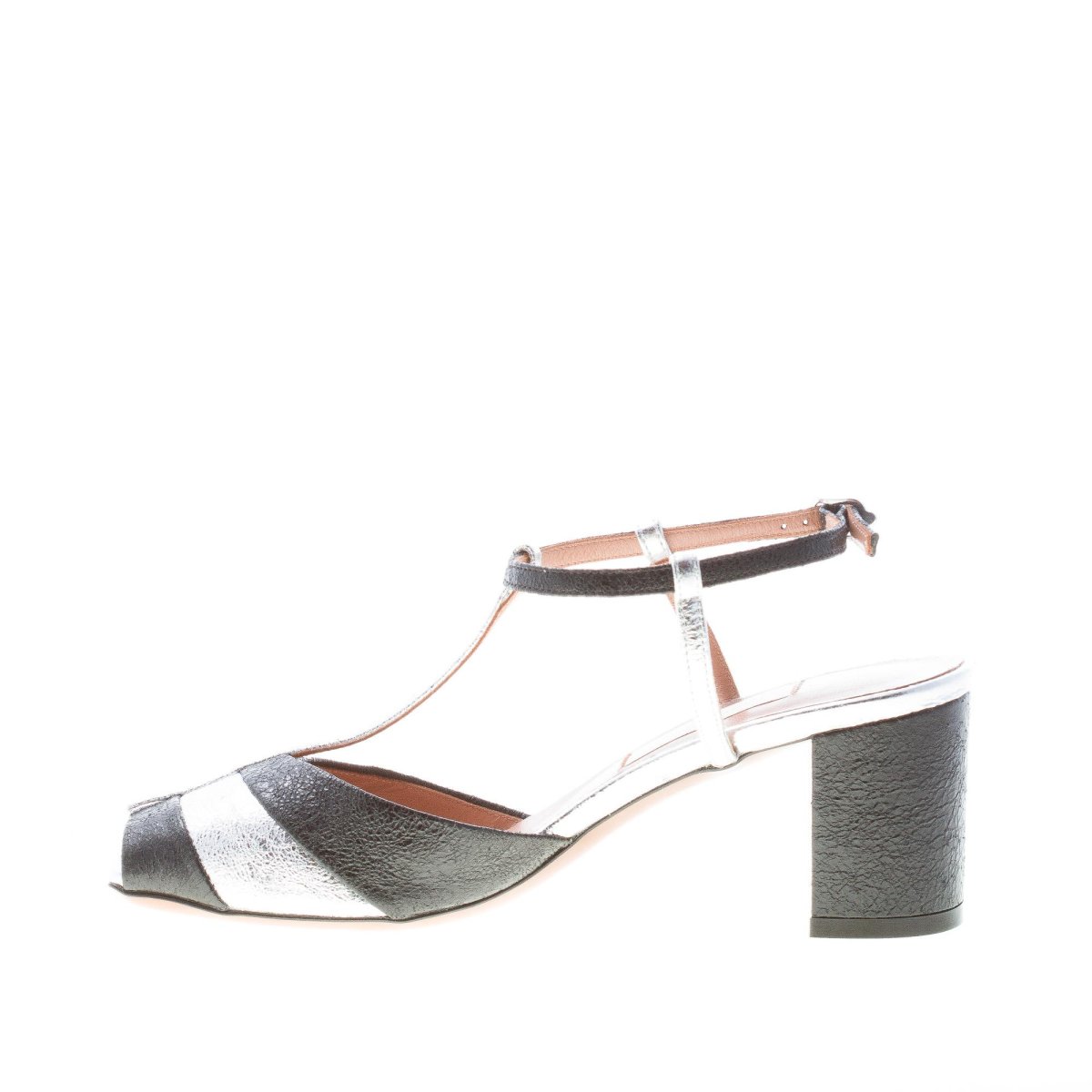 Black and silver crackled effect leather T-strap sandal with a large band open toe and an ankle strap with a silver metal adjustable buckle. Leather sole. Heel 6,5 cm