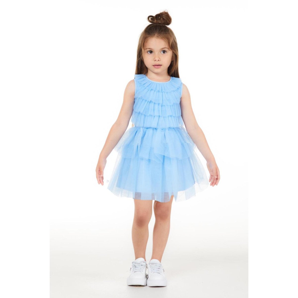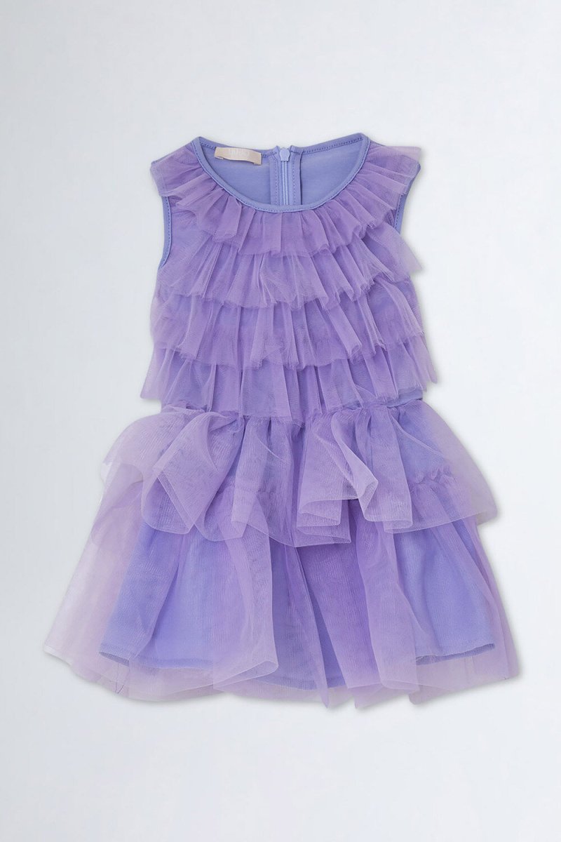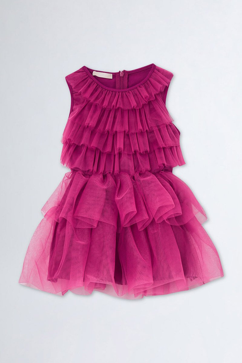 Vestito a balze in tulle Taglio girocollo Sorretto da spalline larghe Elastico in vita Chiusura con zip sul retro