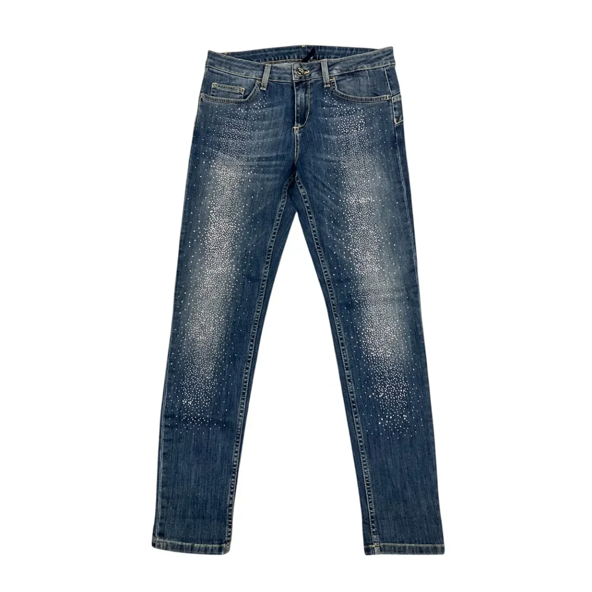 Realizzati in denim blu effetto slavato, sono impreziositi da una decorazione a strass applicati sul davanti delle gambe, che conferiscono un tocco brillante e femminile. Dotati di cinque tasche e chiusura con zip e bottone, uniscono stile casual e glamour, perfetti per outfit dal carattere deciso e ricercato.