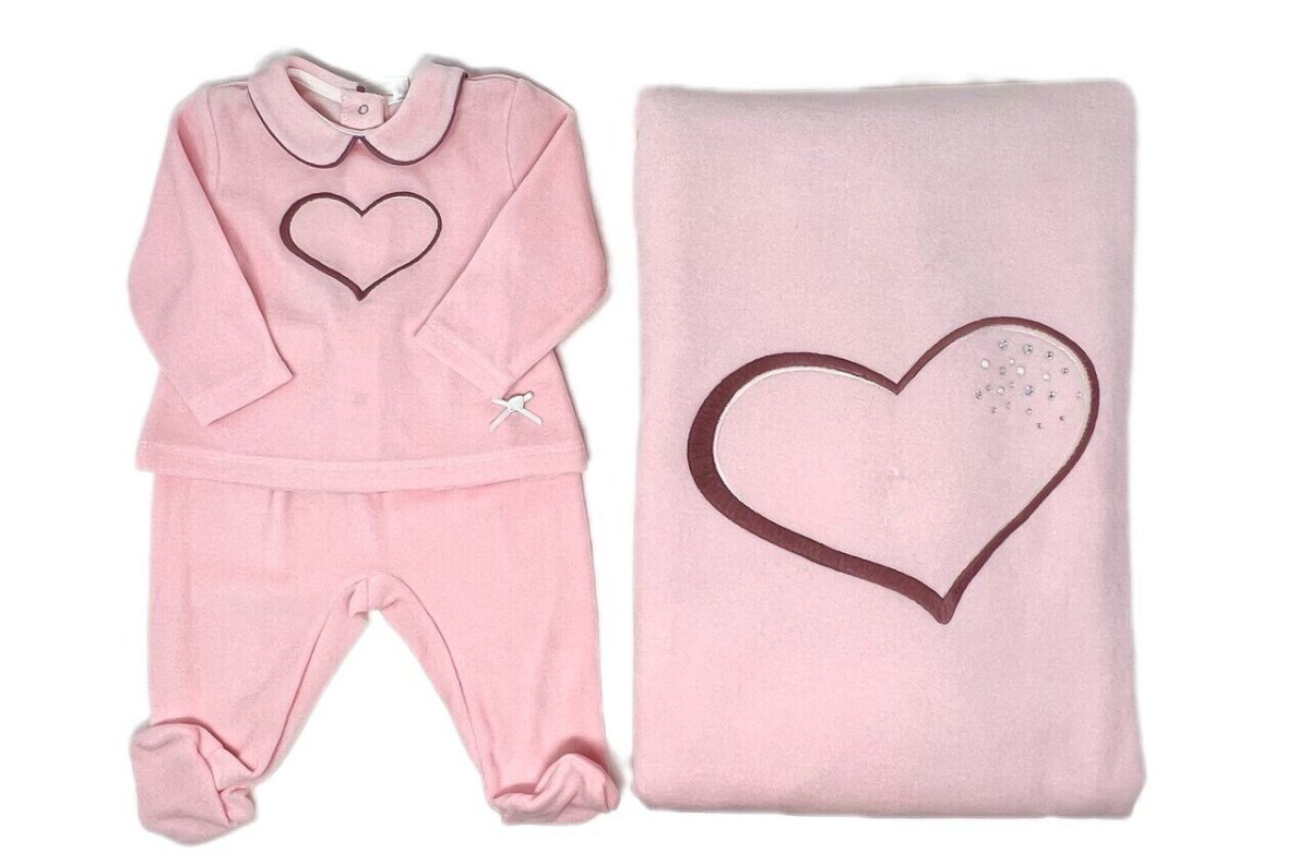 Coordinato coperta e coprifasce in morbida ciniglia rosa, al centro entrambi presentano un cuore ricamato con colore in contrasto.