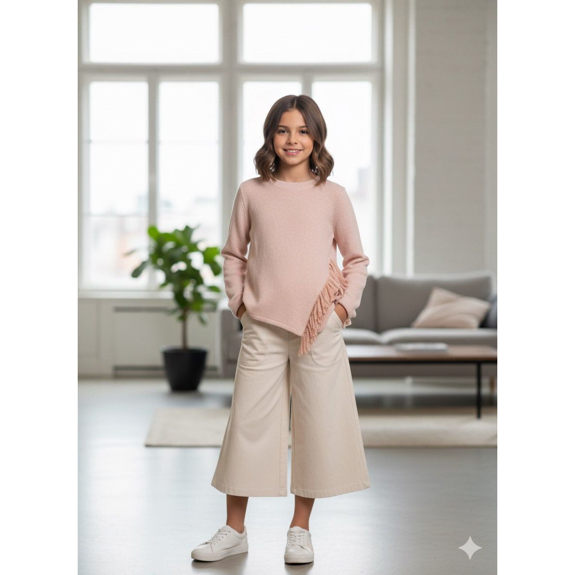 Un completo alla moda, comodo e molto glamour. Pantalone cropped in tessuto elasticizzato Maglia longhette con frangia laterale Made in Italy