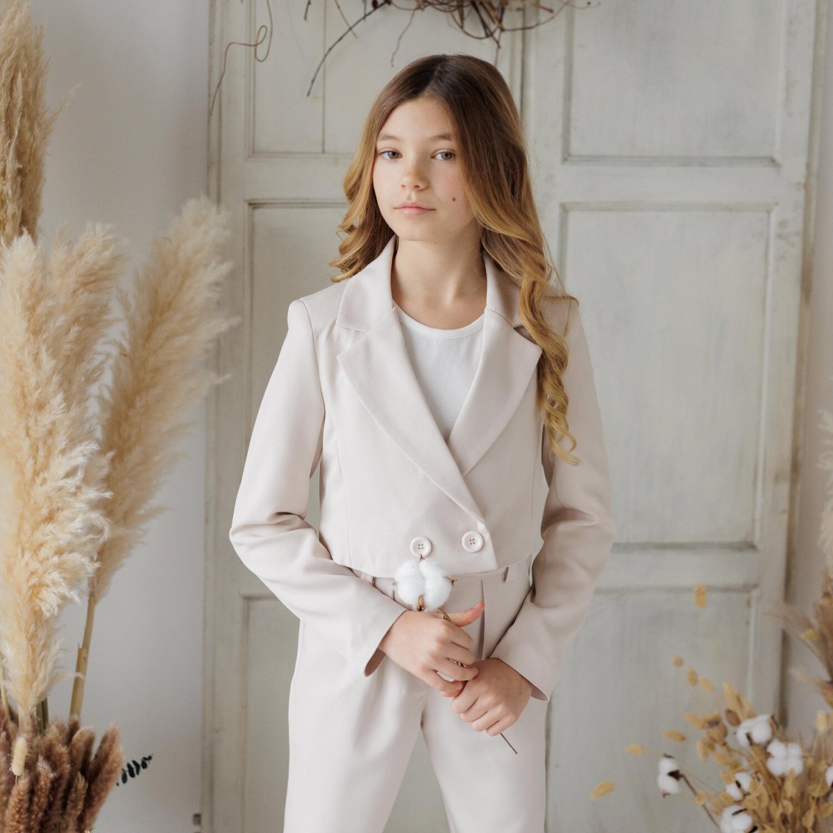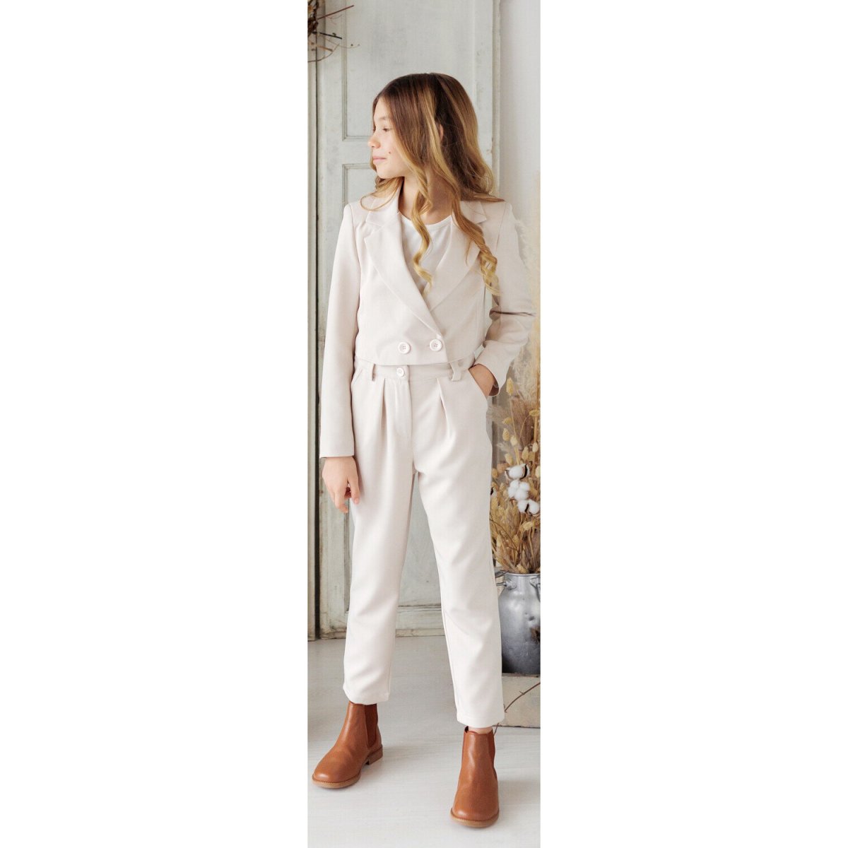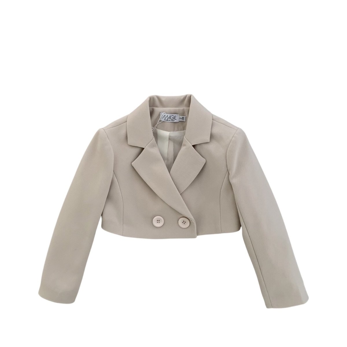 Questo completo elegante si distingue per un design moderno e sofisticato, perfetto per occasioni speciali o cerimonie. Ecco i dettagli principali: Composizione del Completo Il set è realizzato in un delicato color beige sabbia, una tonalità neutra che trasmette un’eleganza senza tempo. Giacca Crop: Taglio: Presenta una silhouette accorciata (modello crop) che dona un tocco contemporaneo al classico blazer. Dettagli: È caratterizzata da ampi revers a lancia e una chiusura a doppio petto con due grandi bottoni coordinati. Pantaloni: Stile: Pantaloni sartoriali a vita alta che si abbinano perfettamente alla lunghezza della giacca. Taglio: gamba dritta , con pieghe frontali…