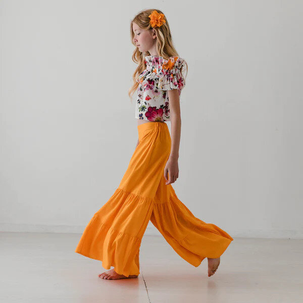 Pantalone in run di viscosa, Modello ampio con balze, Dettaglio Spacco, Closure: Slip-on, Sfoderato Composizione: 100% Viscosa Top in popeline di cotone stampato, Scollo dritto, Spalle scoperte Composizione: 100% Cotone
