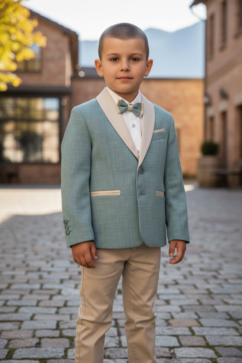 Completo elegante da cerimonia adatto per Battesimo Paggetti ed Eventi Composto da 4 Pezzi: Giacca โ Camicia โ Papillon โ Pantalone โ Giacca con rever che richiama il pantalone โ Vestibilitร : Normale Questo completo รจ progettato con attenzione e cura, offrendo una combinazione perfetta di eleganza e stile