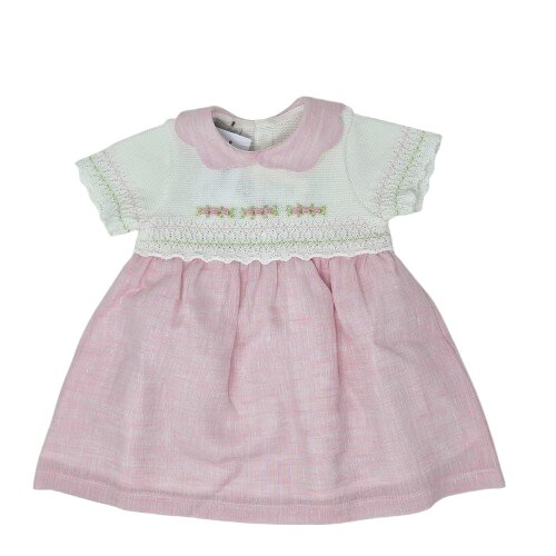 Delizioso abitino mezza manica 50% lino 50% cotone. Il corpetto in maglia è arricchito con ricami e una lavorazione con piccole losanghe Collettino smerlato in tessuto Sottogonna 100% cotone