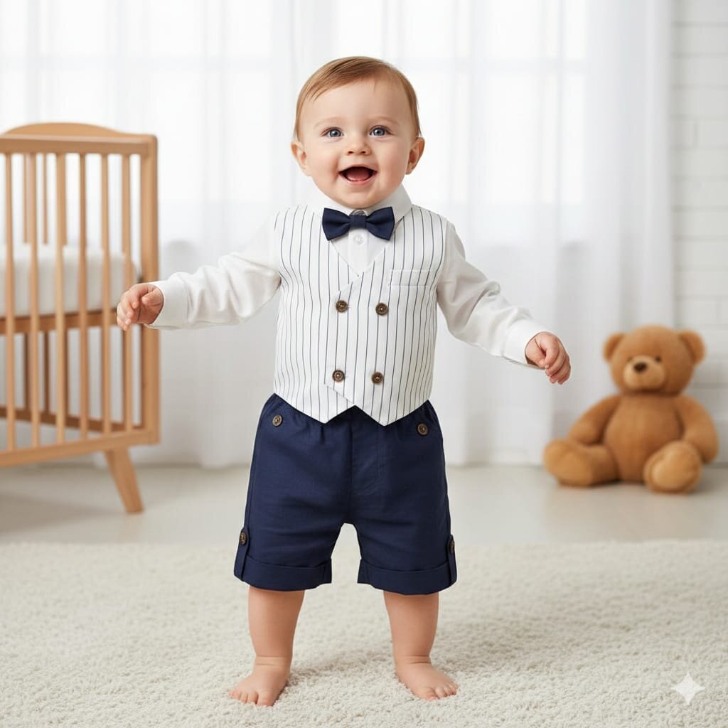 Completo elegante 4 pezzi Pantalone all’inglese blu chiaro Gilet doppio petto fondo bianco a righe blu chiaro Camicia maniche lunghe con possibilità di accorciare le maniche con il bottoncino Papillon