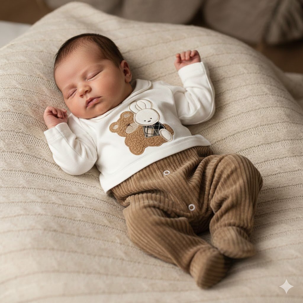 Originale tutina bi-materiale la parte superiore in caldo cotone con applicazione di un orsetto in lana bouclè e di un coniglietto in ciniglia la parte inferiore è realizzata in velluto a coste.