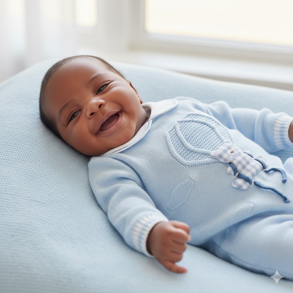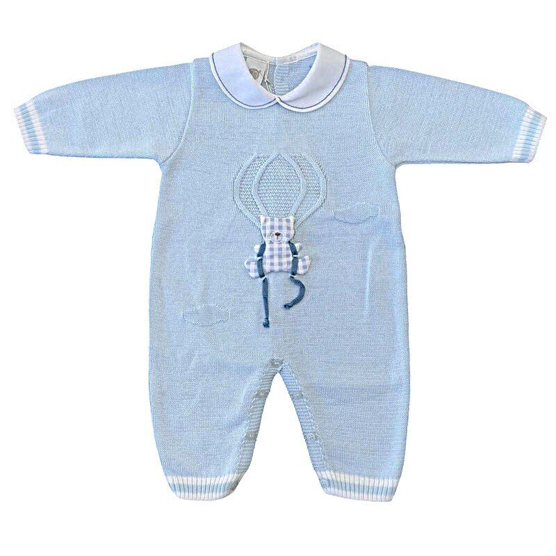 Tutina in Maglia Celeste “Teddy Paracadutista” Eleganza e dolcezza si incontrano in questa splendida tutina intera, realizzata in una morbidissima maglia rasata di colore celeste pastello. Un capo classico e senza tempo, perfetto per i primi mesi del neonato. Dettagli di Design: Ricamo Centrale: Il protagonista del capo è un tenero orsetto in tessuto a quadretti (vichy) bianchi e azzurri, applicato al centro. L’orsetto è raffigurato mentre vola con un paracadute ricamato a rilievo, aggiungendo un tocco giocoso e tridimensionale. Colletto Peter Pan: Un elegante colletto bianco a punta tonda con bordino celeste a contrasto dona un’aria sofisticata e ordinata.…