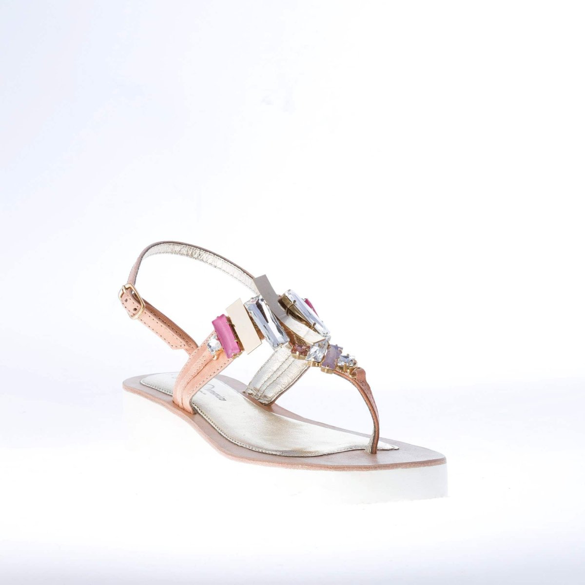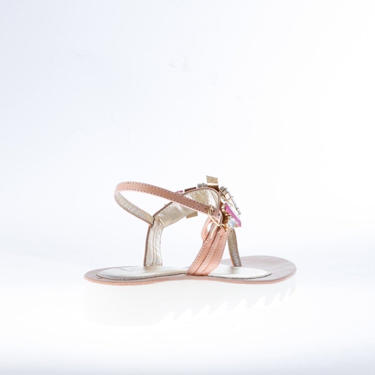 Natural leather thong sandal with jeweled embellishment on vamp. Heel 3,5 cm. Light rubber sole