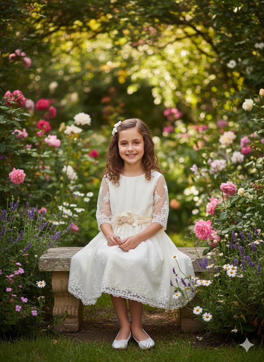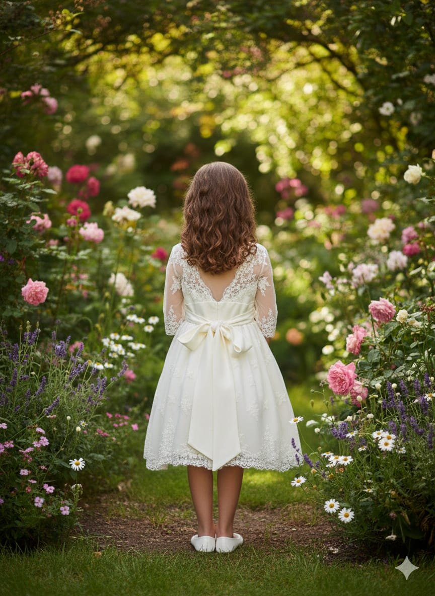 Elegante abito da cerimonia Realizzato in prezioso tulle ricamato. Manichette lunghezza 3/4 Profonda scollatura sulla schiena Cintura in tulle con decorazione floreale Sottogonna
