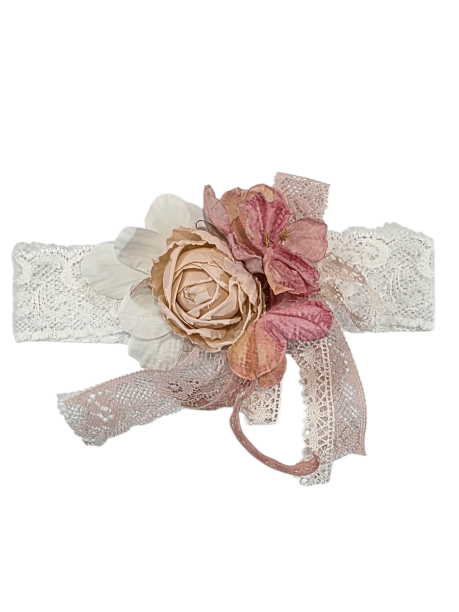 Raffinata fascia per capelli con fiori artificiali, ideale per impreziosire abiti da cerimonia con un tocco assolutamente chic.
