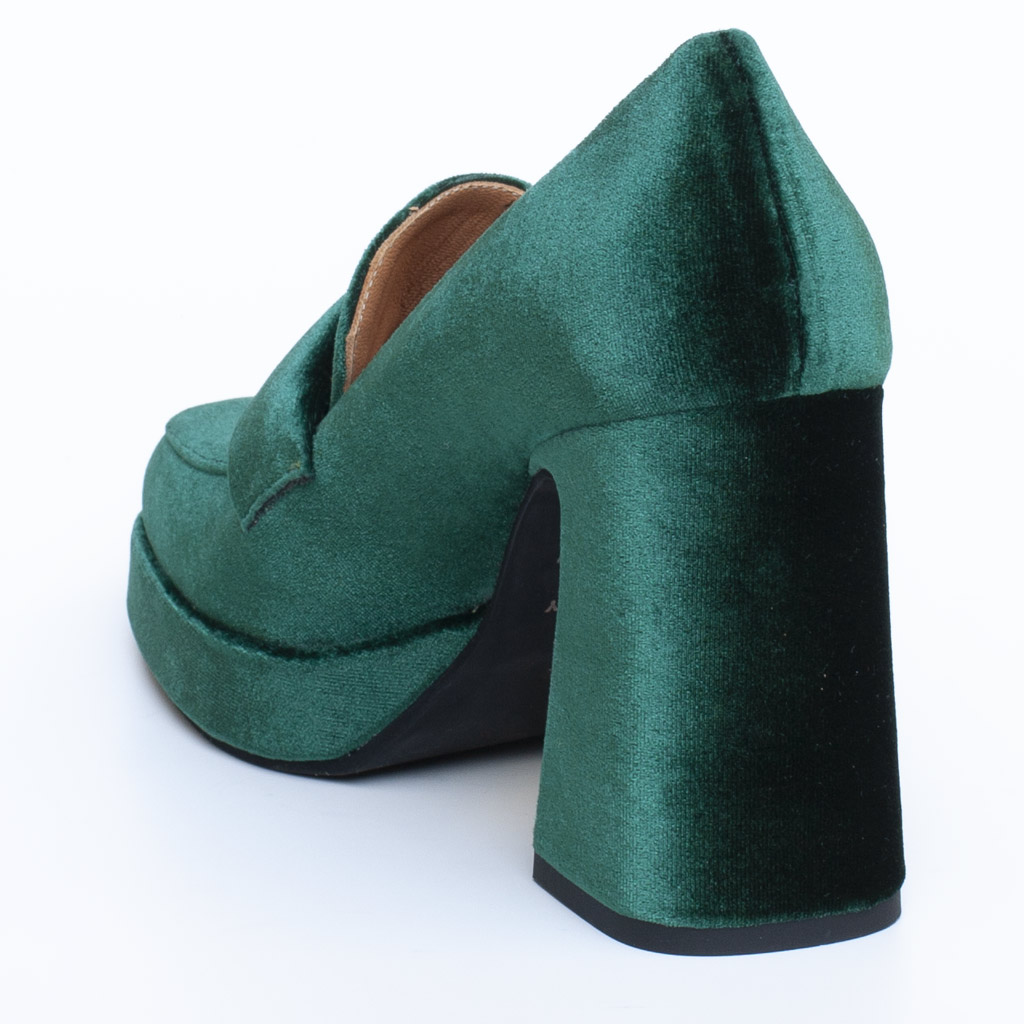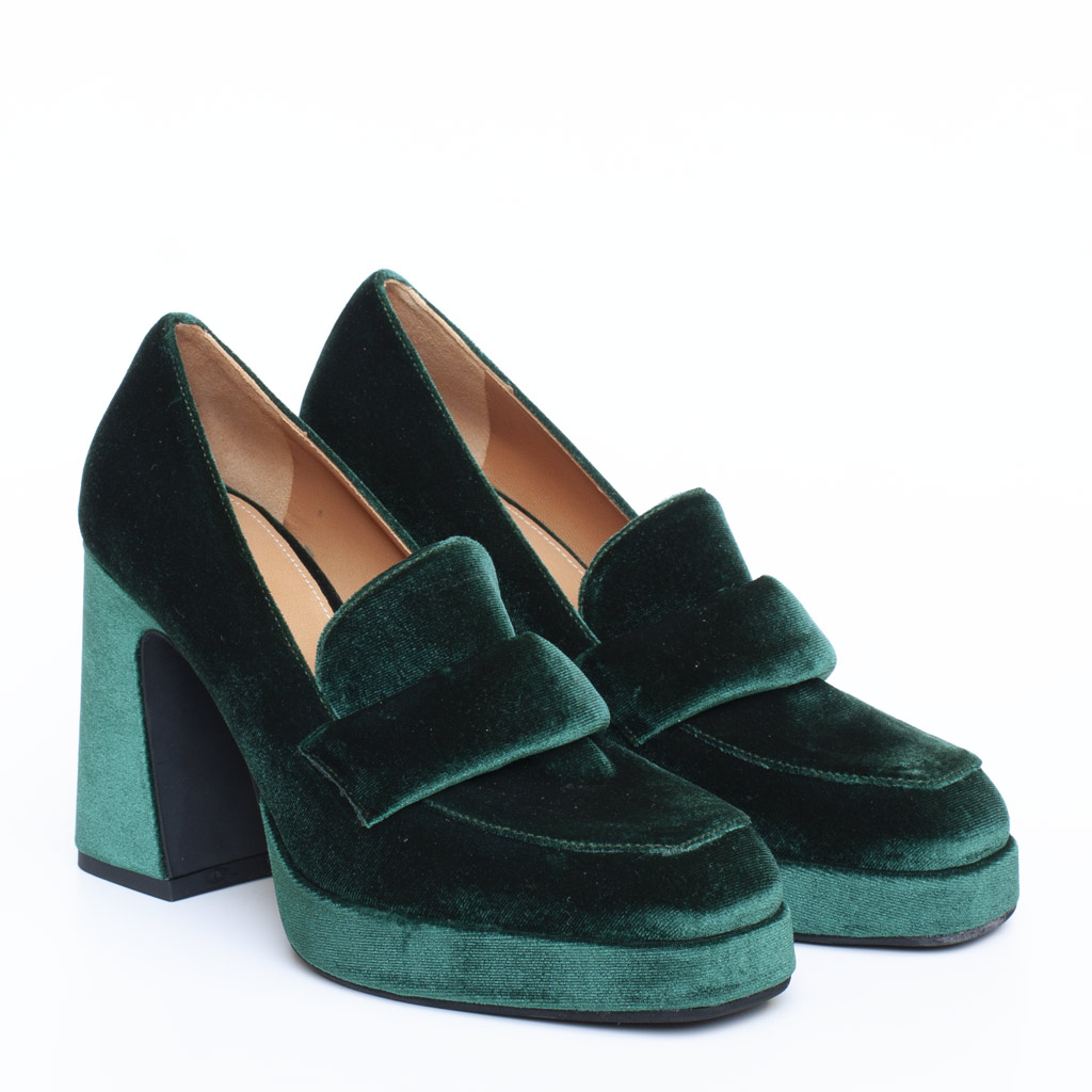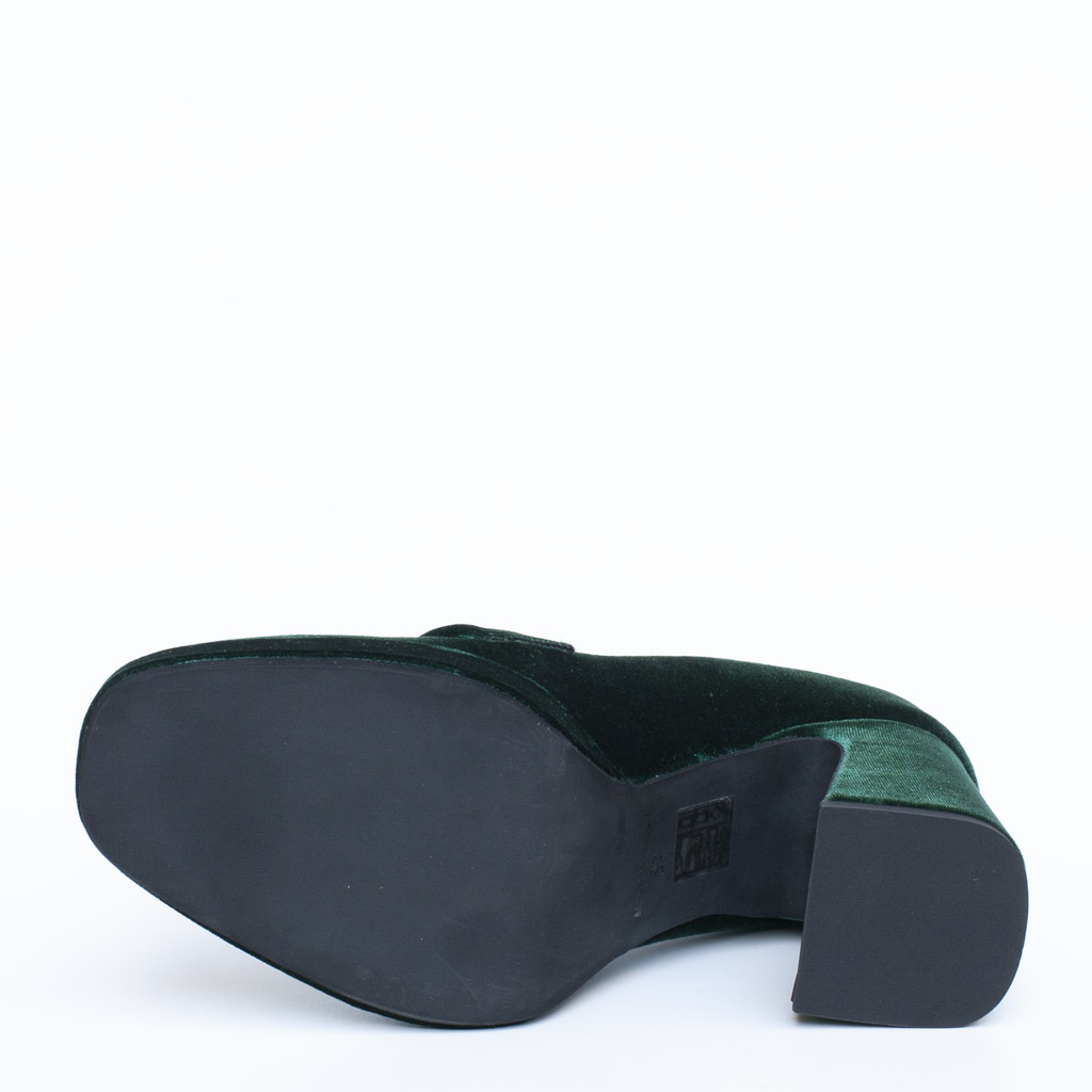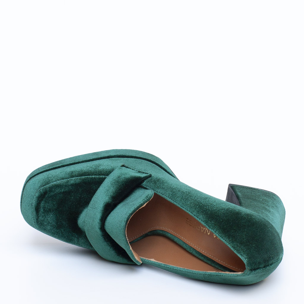 Scarpa in velluto verde. Altezza tacco 9 cm. Plateau 2 cm. Fodera in pelle. Suola in gomma. Made in Italy.
