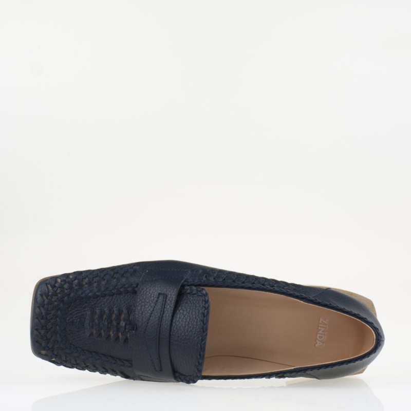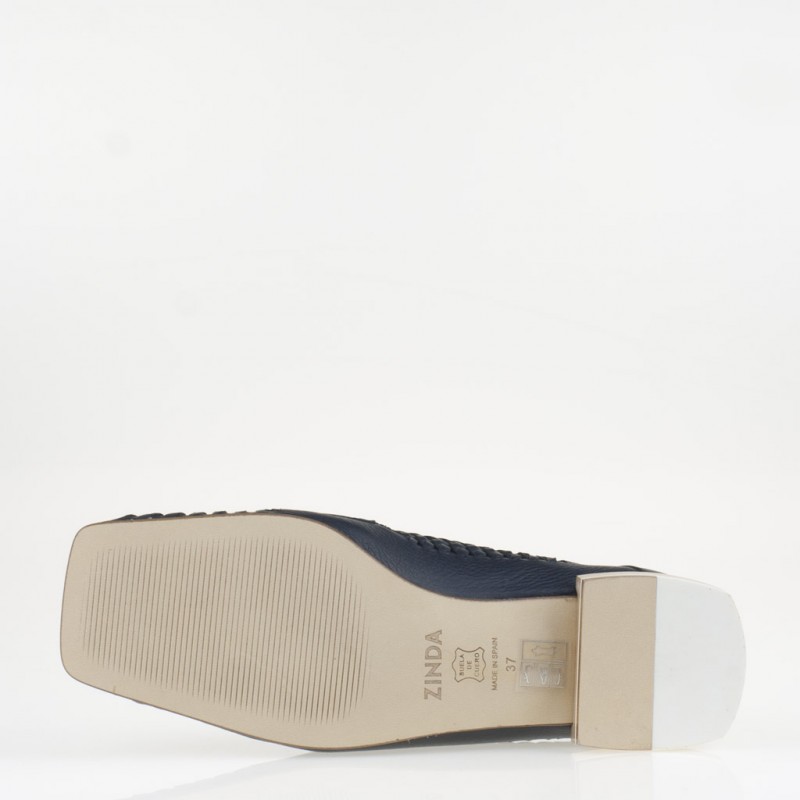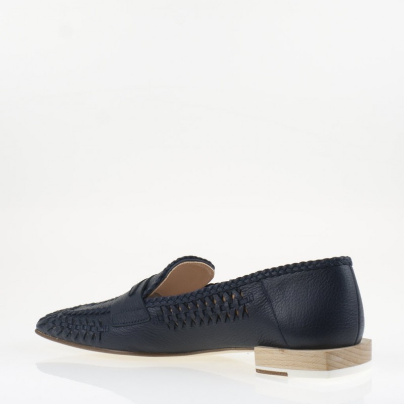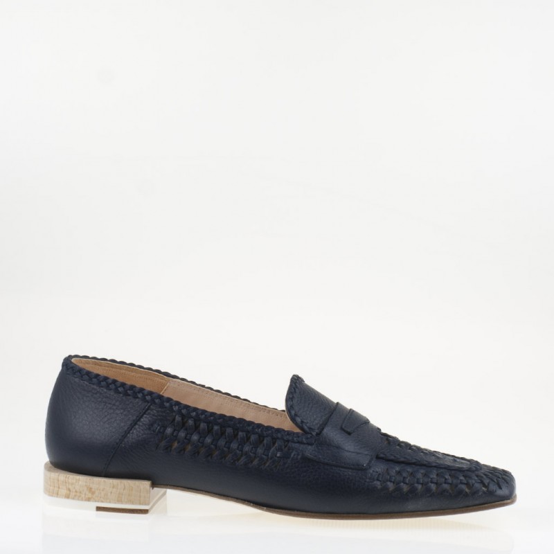 Mocassino in pelle intrecciata, con effetto traforato. Scarpa dalla punta squadrata. Altezza tacco 2 cm. Fodera in pelle. Suola in cuoio. Tacco in legno a blocco. Realizzato artigianalmente in Spagna.