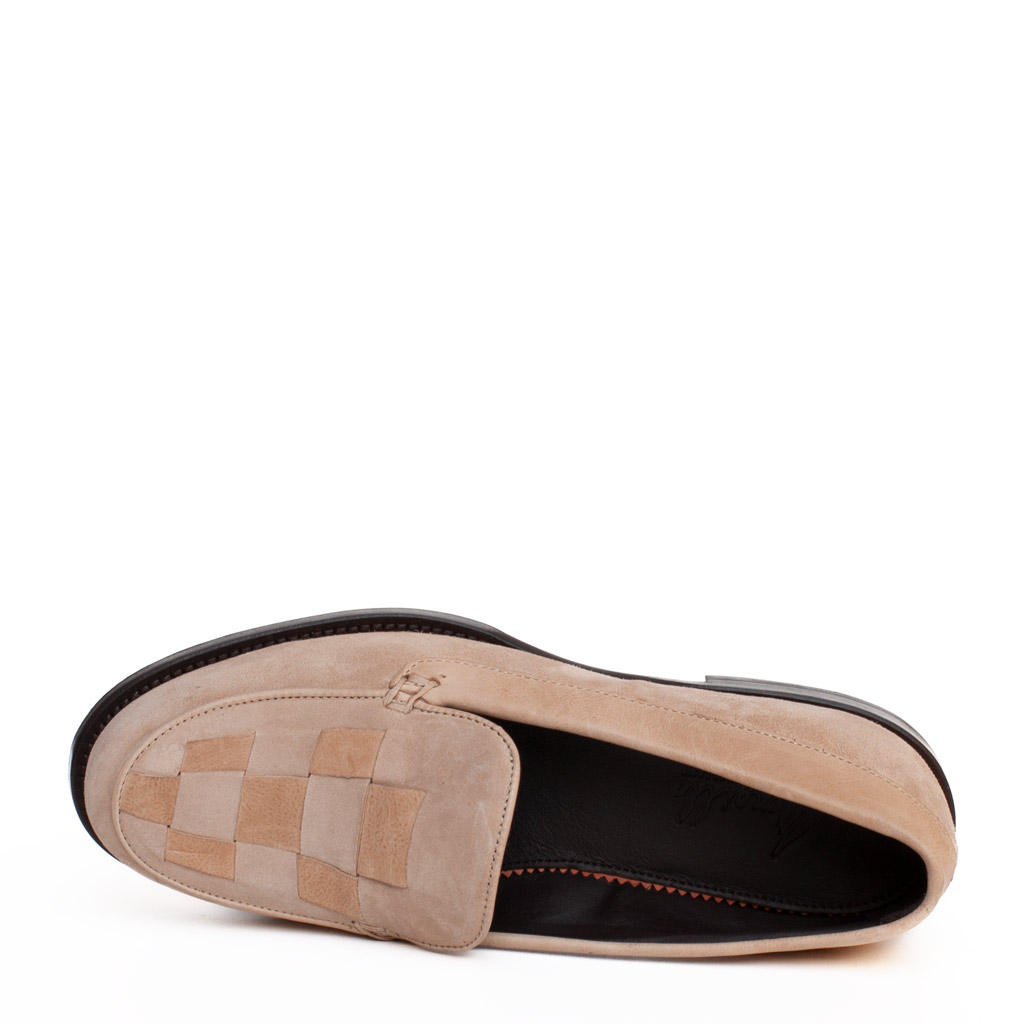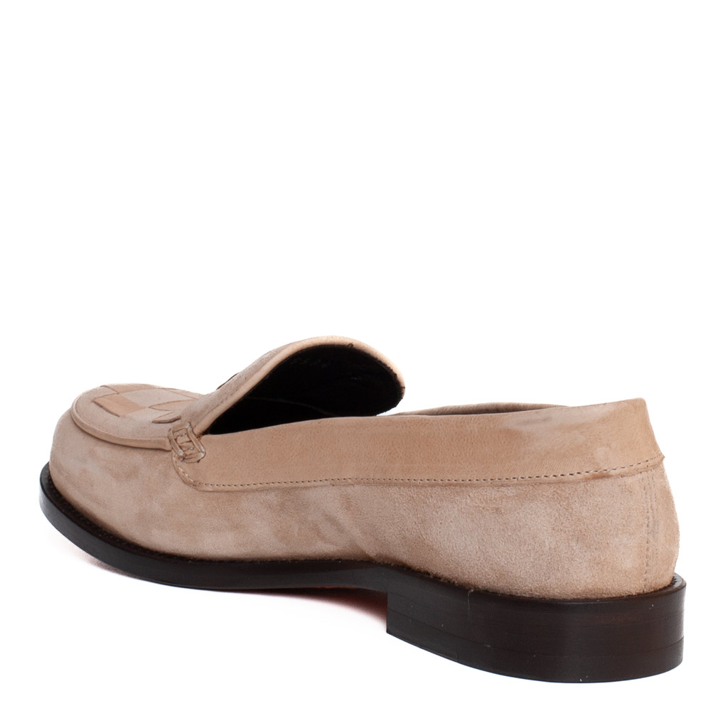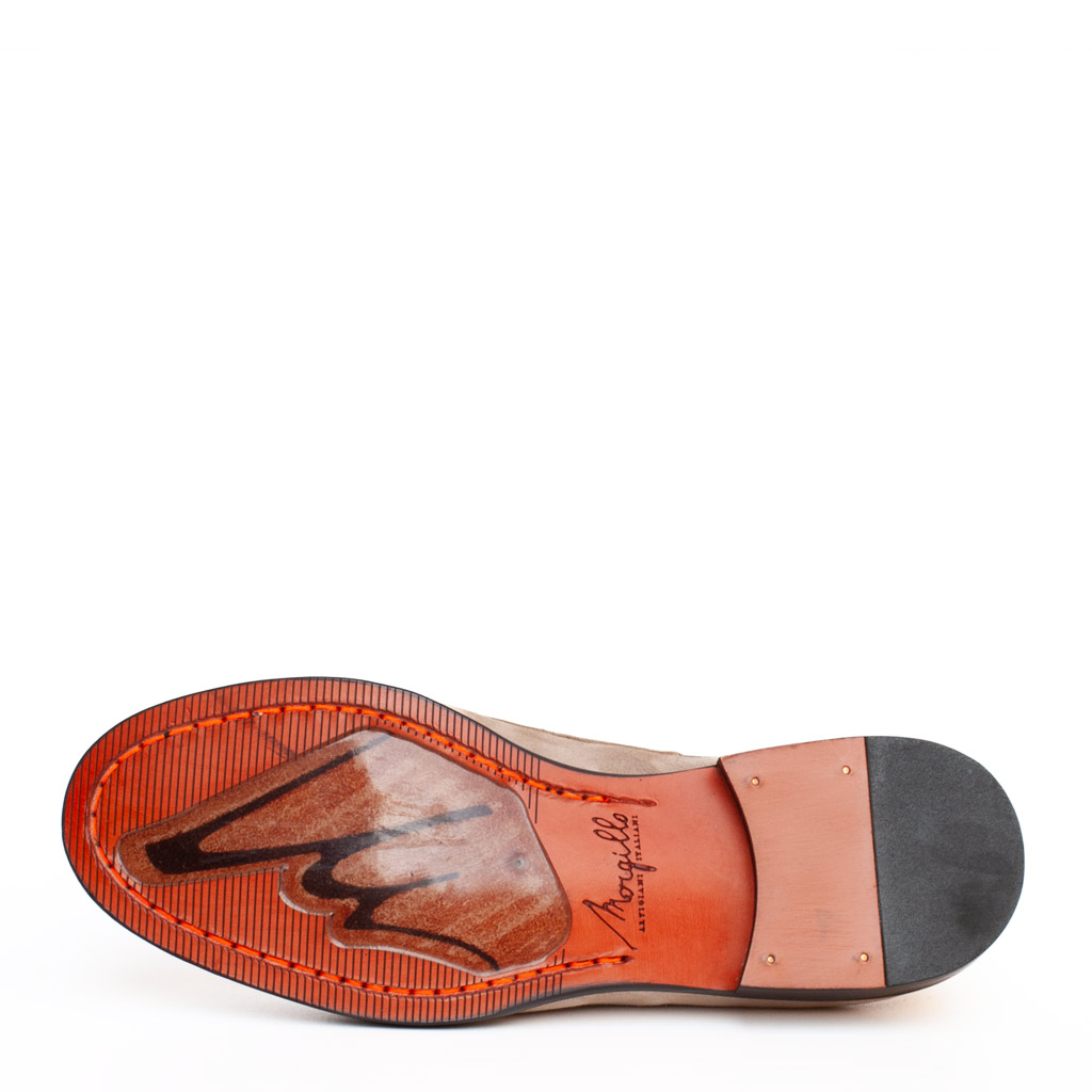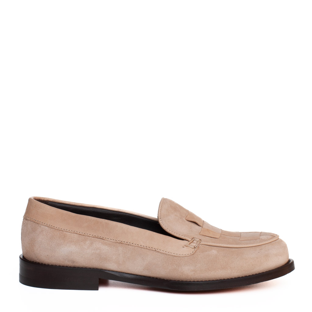 Mocassino in morbido camoscio con inserti in pelle. Altezza tacco 2 cm. Fodera in pelle. Suola in cuoio con inserto in gomma antiscivolo. Realizzato artigianalmente in Italia.Fodera in pelle