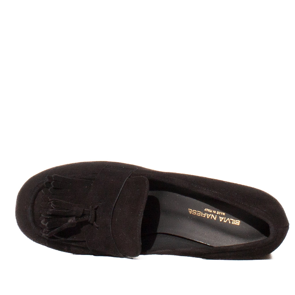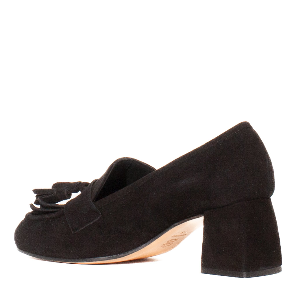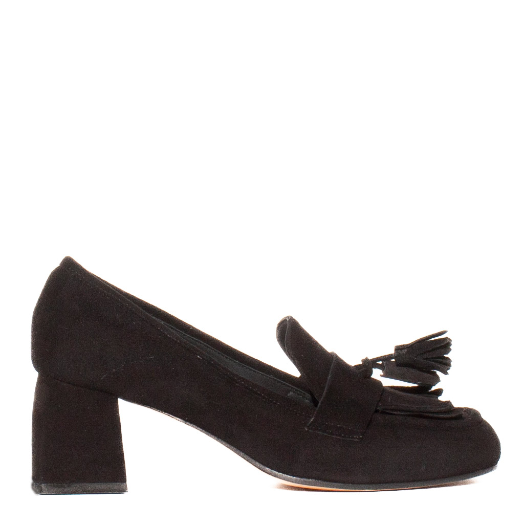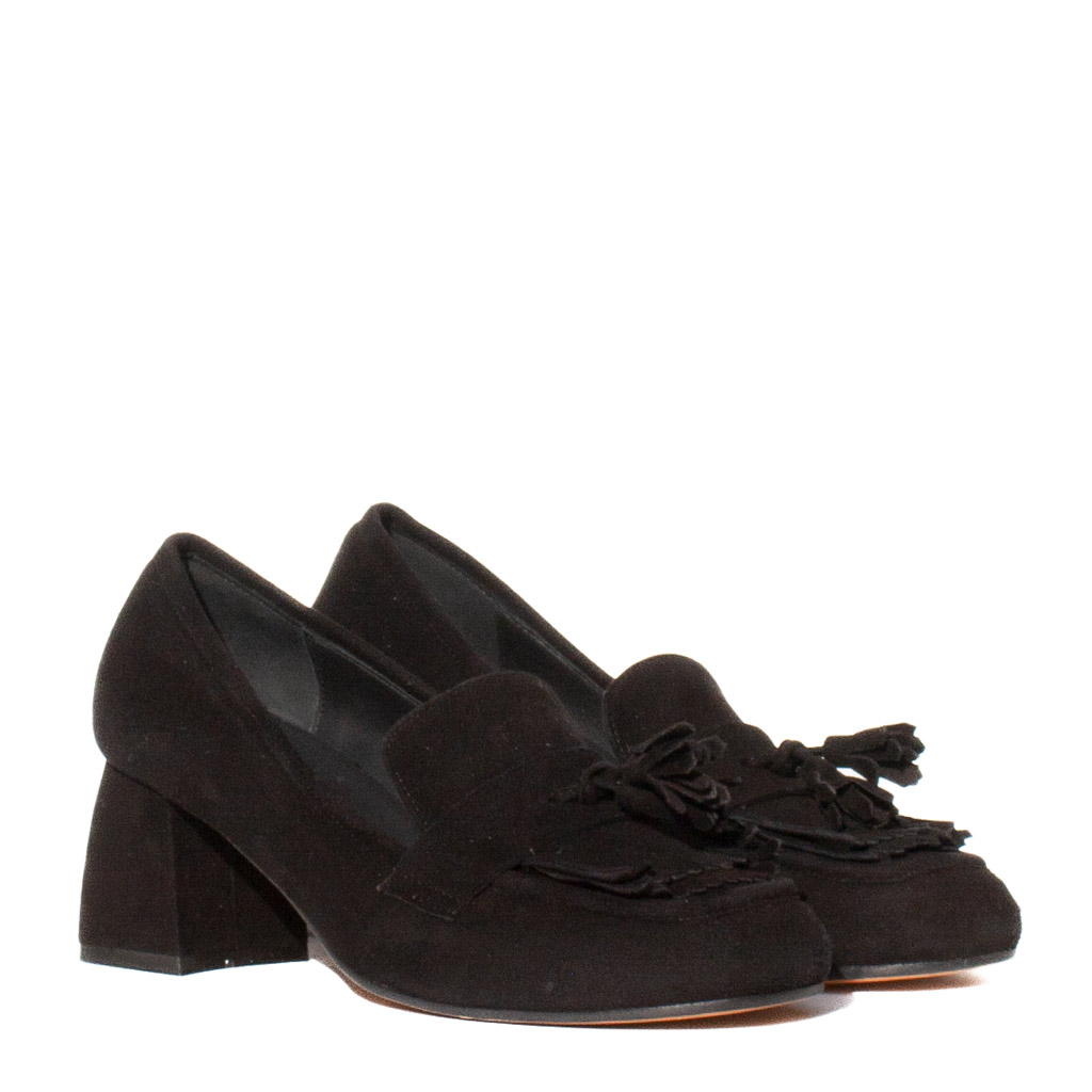 Mocassino Camoscio Nero Tacco Medio Nappine Frange
