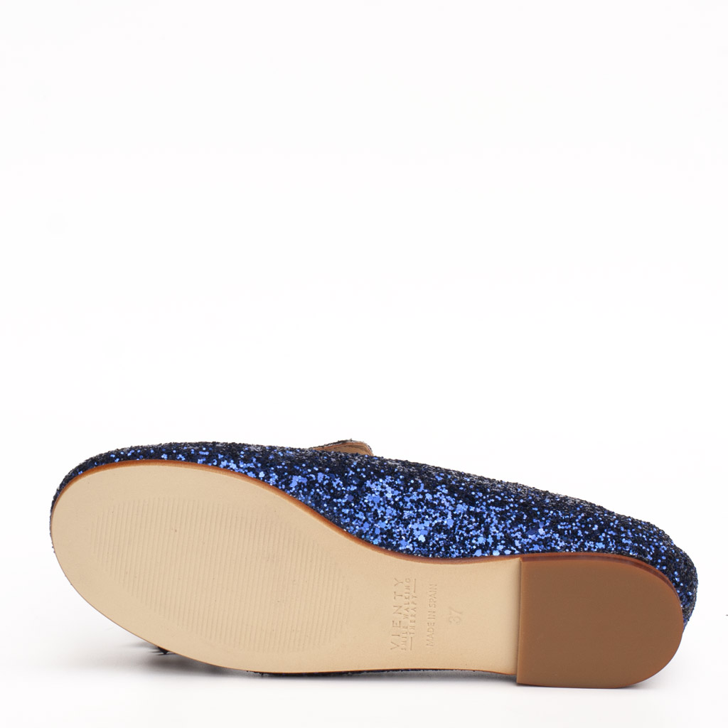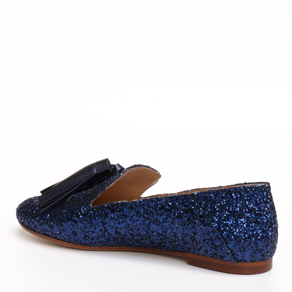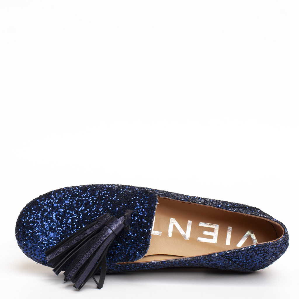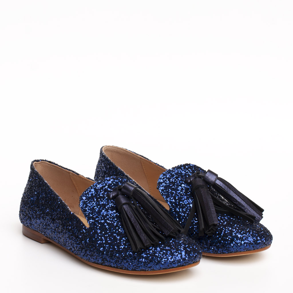 Scarpa in tessuto glitterato con nappine. Altezza tacco 2 cm. Fodera in pelle. Suola in cuoio.