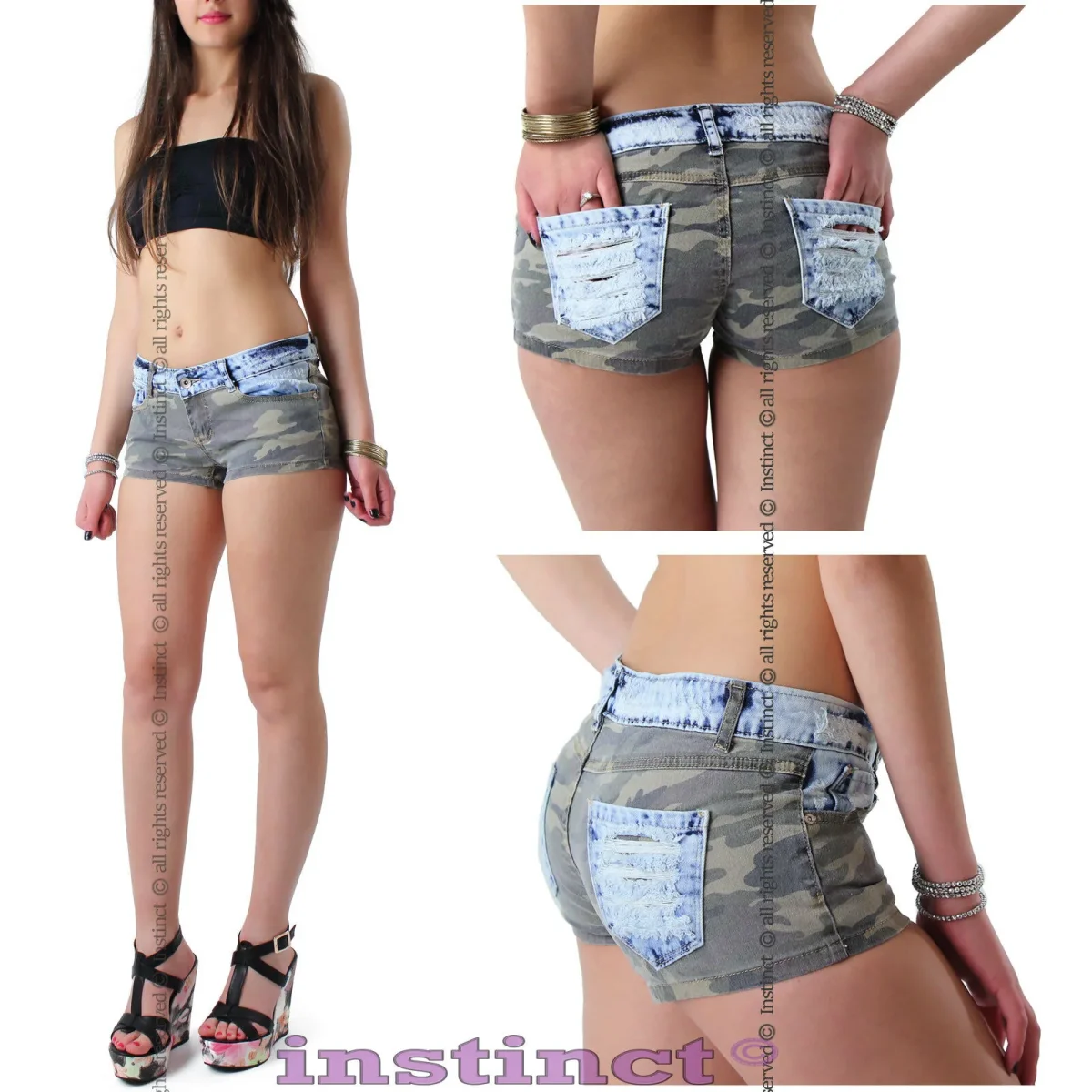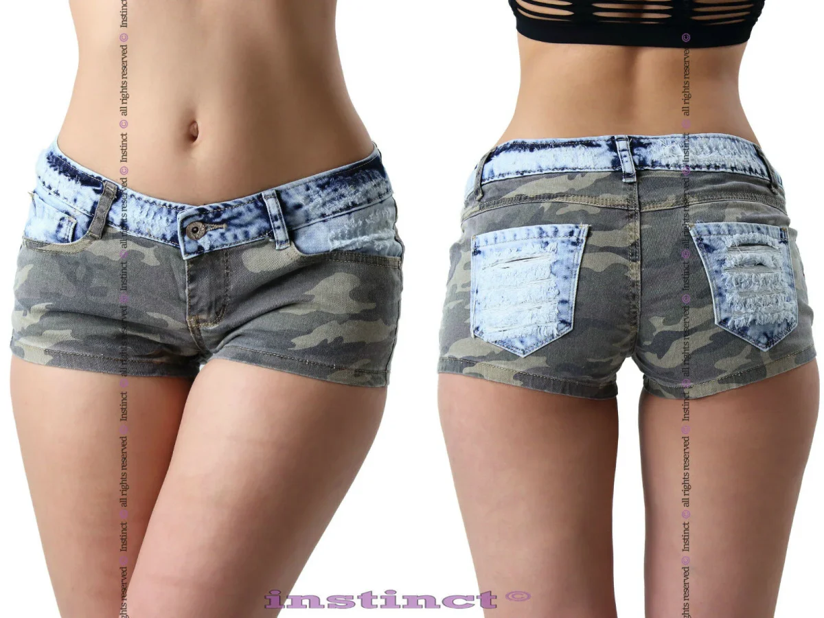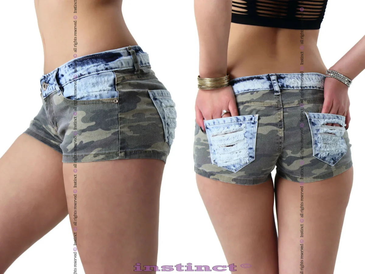 Shorts jeans style mini short aderenti a vita bassa. La combinazione di due colori mimetico e denim hanno reso questo modello unico nel suo genere. Se poi vogliamo aggiungere anche la decorazione a strappi sulle taschine posteriore allora si che diventa il TOP del momento. Un modello sicuramente da non perdere per le amanti dello style provocatorio.