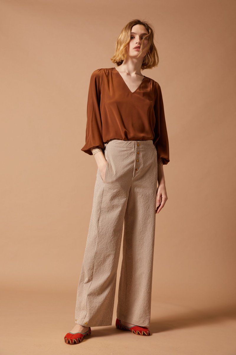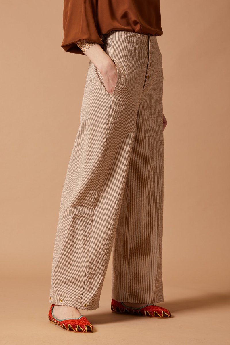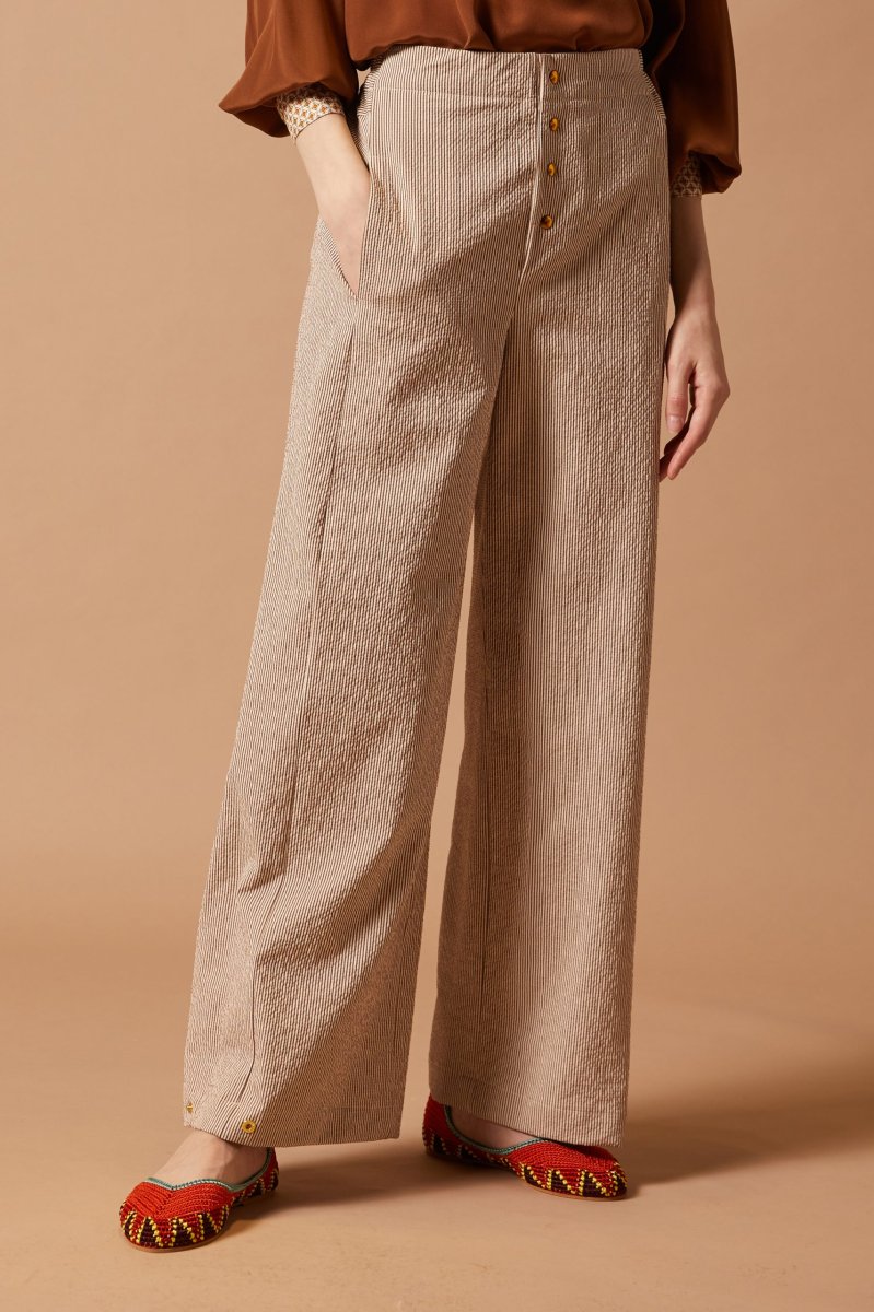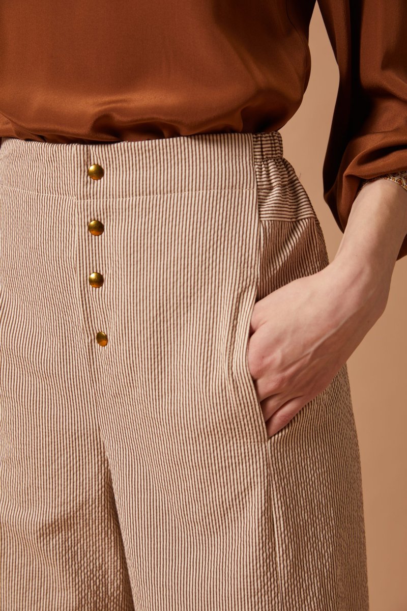 Pantaloni Eva in cotone seersucker a righe panna e marrone