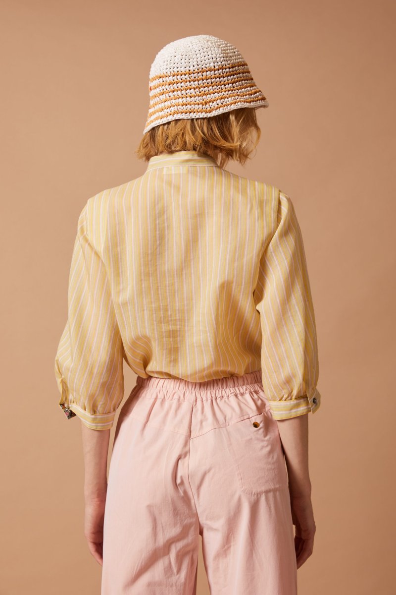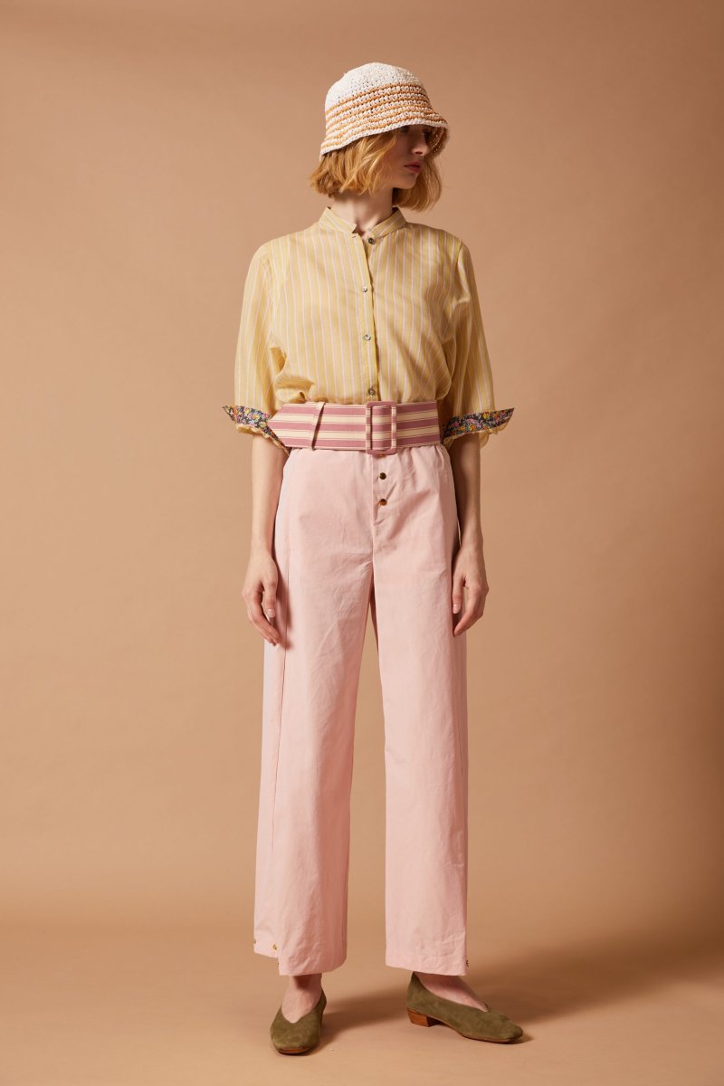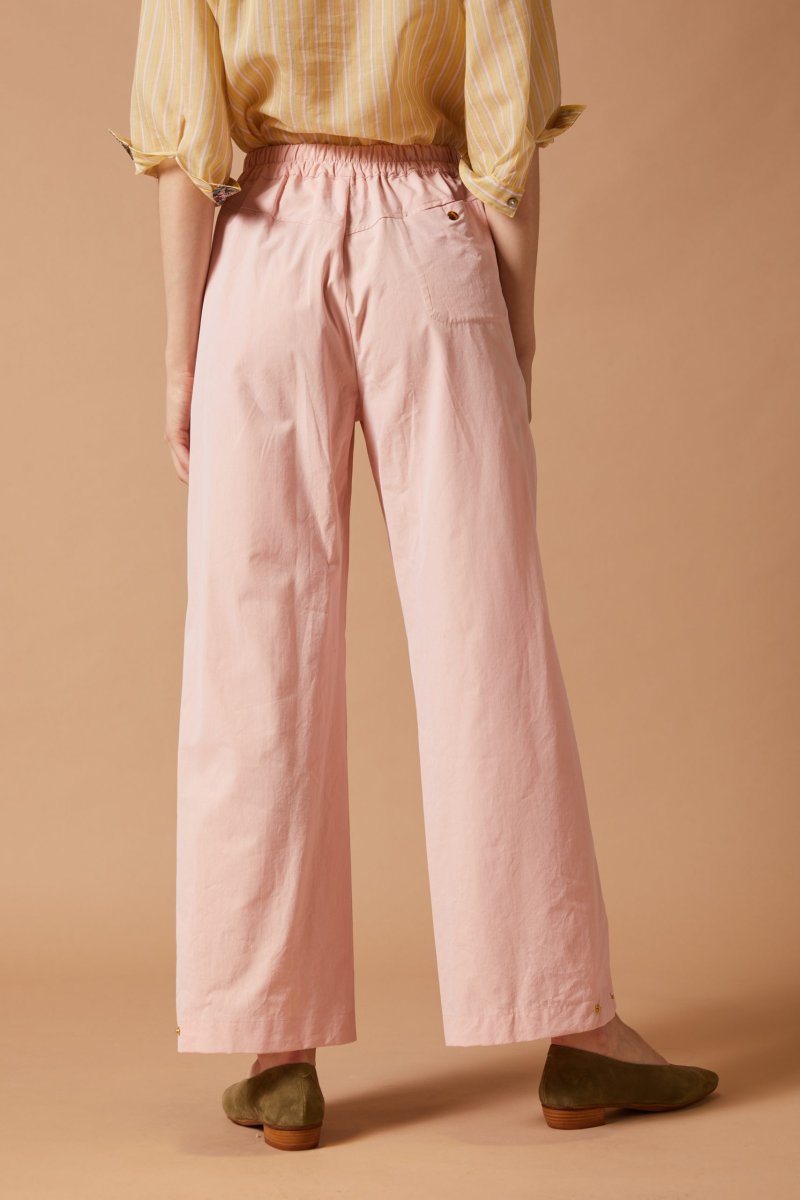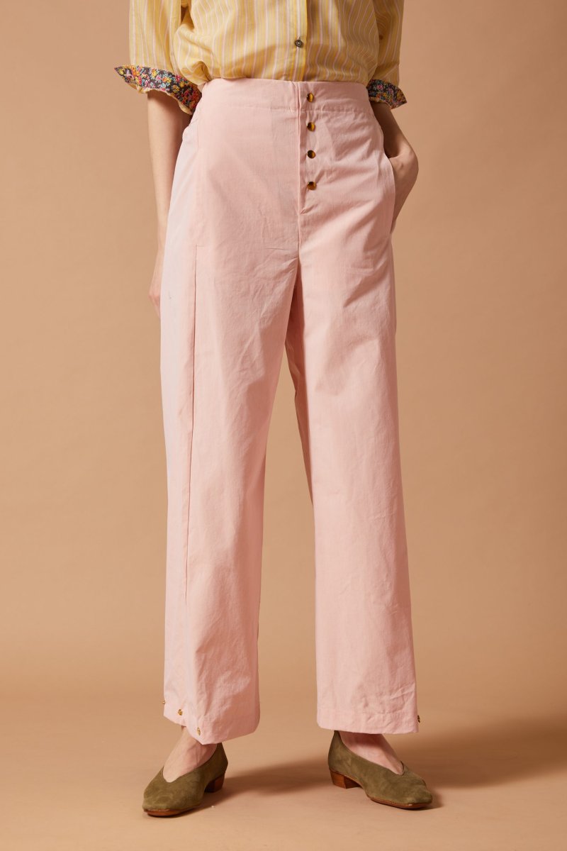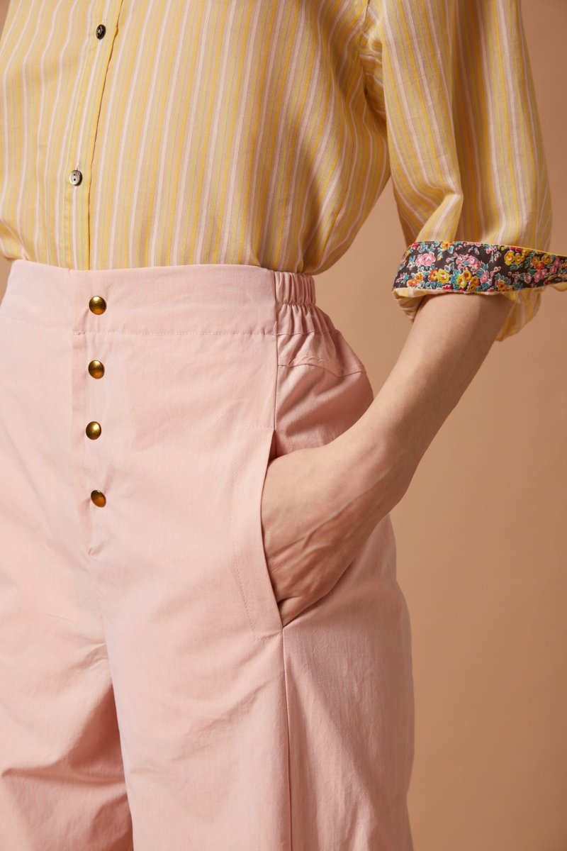 I pantaloni Eva di Carla Saibene sono il nuovo modello di pantaloni casual chic con vita leggermente alta, bottoni a pressione sul davanti, gamba dritta e tasche sui fianchi. L’elastico sul retro della vita e la possibilitร di chiudere il fondo della gamba con bottoni rendono questo capo molto versatile e facile da indossare sia con i tacchi che con scarpe piatte. La versione in popeline di cotone rosa tenue รจ perfetta indossata con un top di cotone a righe o a fiori e un paio di ballerine, per un look primaverile romantic chic. Vedi altre varianti 100%…