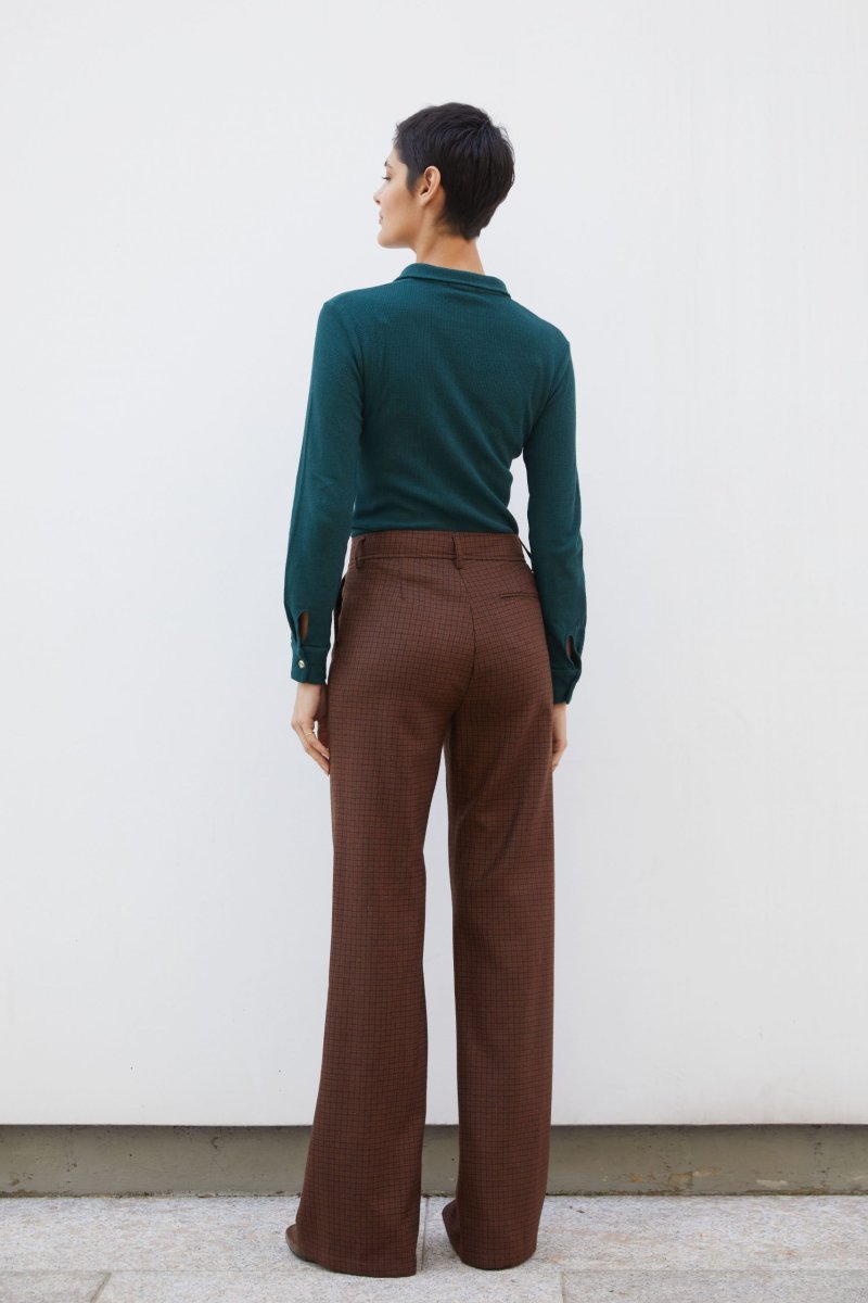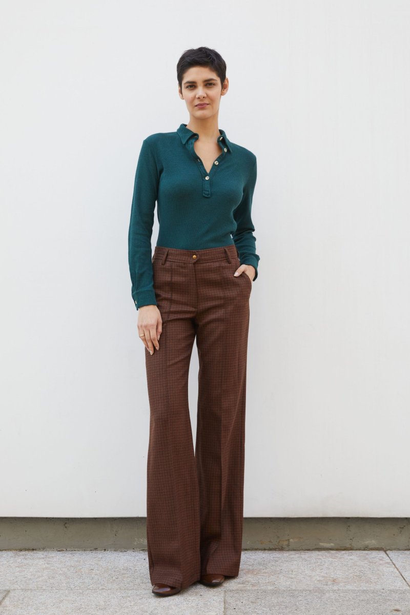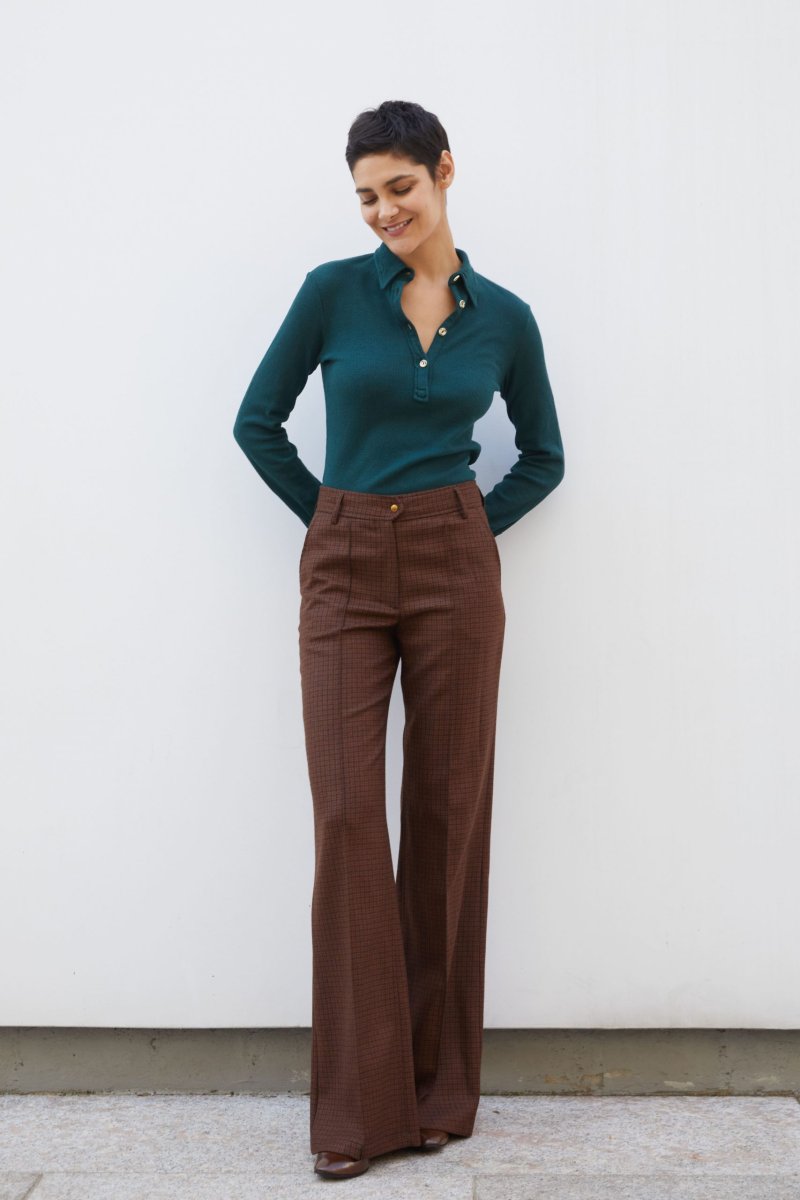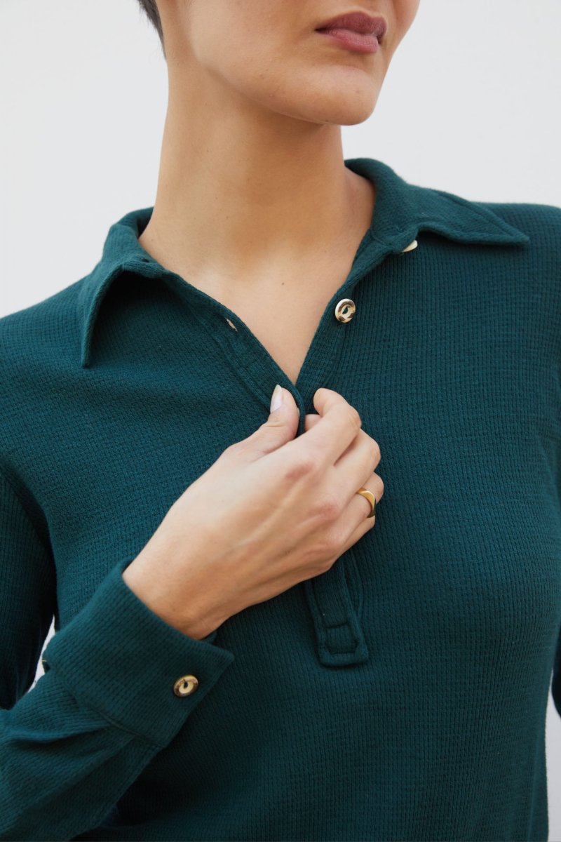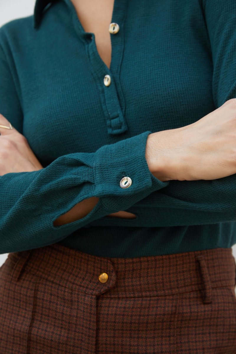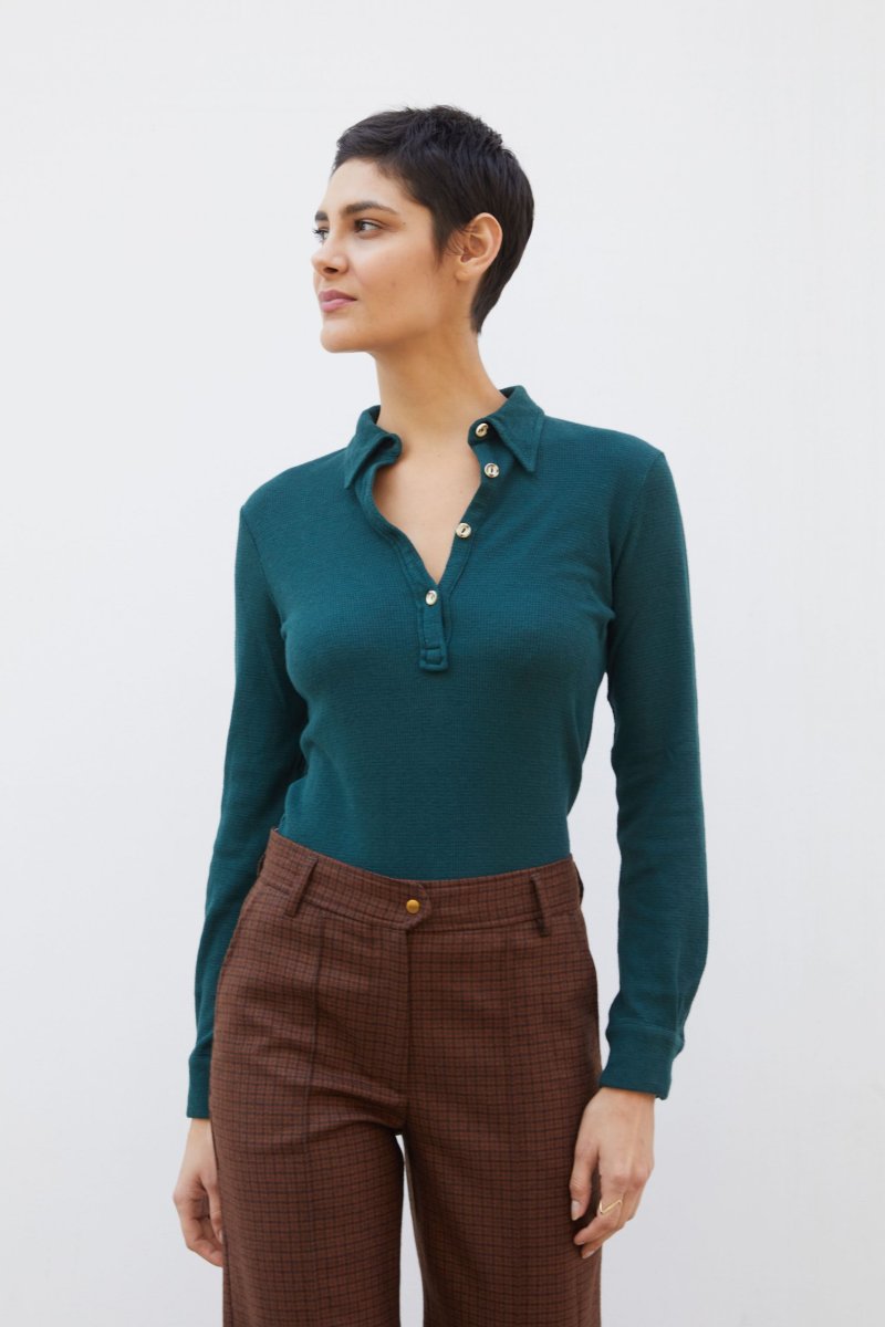 Polo Ariel in jersey di cotone e lino verde bottiglia a costine operate di Carla Saibene, con piccolo colletto, maniche lunghe con polsino, vestibilitร asciutta dal mood Seventies. Vedi altre varianti 70% cotone-30%lino Made in Italy Maniche lunghe a camicia Abbottonatura a polo con bottoni effetto corno