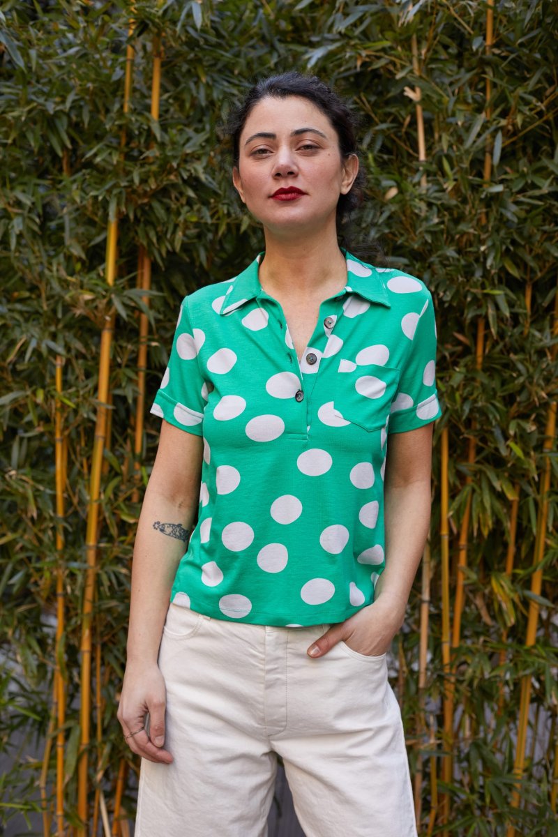 Polo in jersey verde acqua a pois bianchi di Carla Saibene, con piccolo colletto e vestibilitร asciutta dal mood Seventies, รจ perfetta da abbinare ad un pantalone bianco oppure indossata sotto un blazer per dare un tocco divertente. 60% viscosa 35% cotone 5% elastane Maniche corte Abbottonatura a polo Disponibile in altre fantasie Vestibilitร asciutta: la modella รจ alta 174 cm e indossa la taglia S