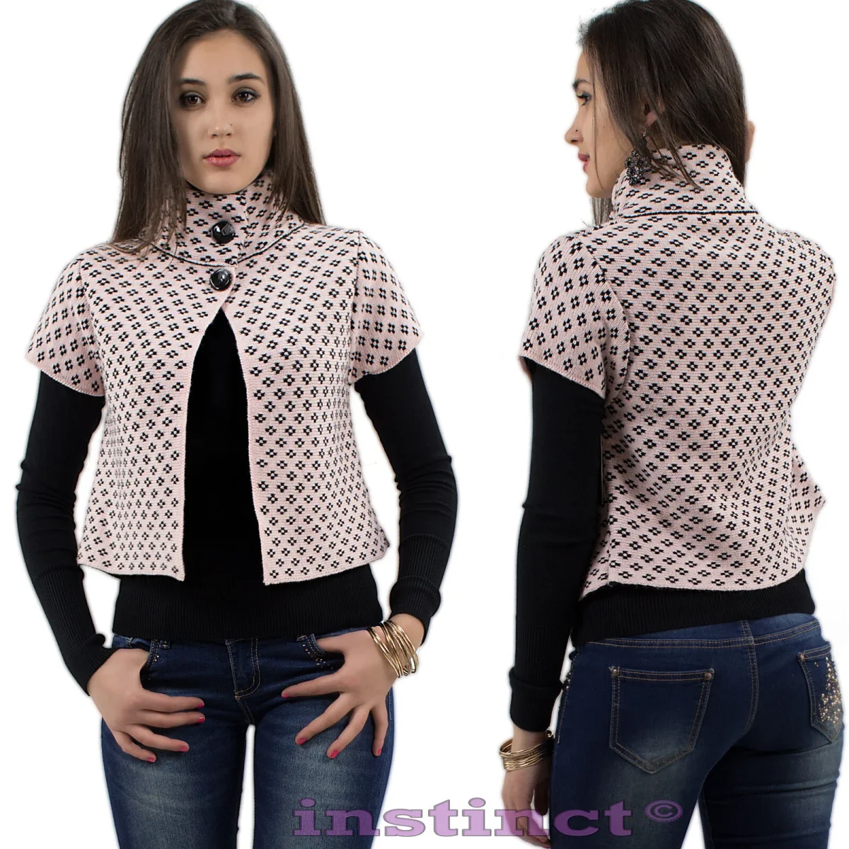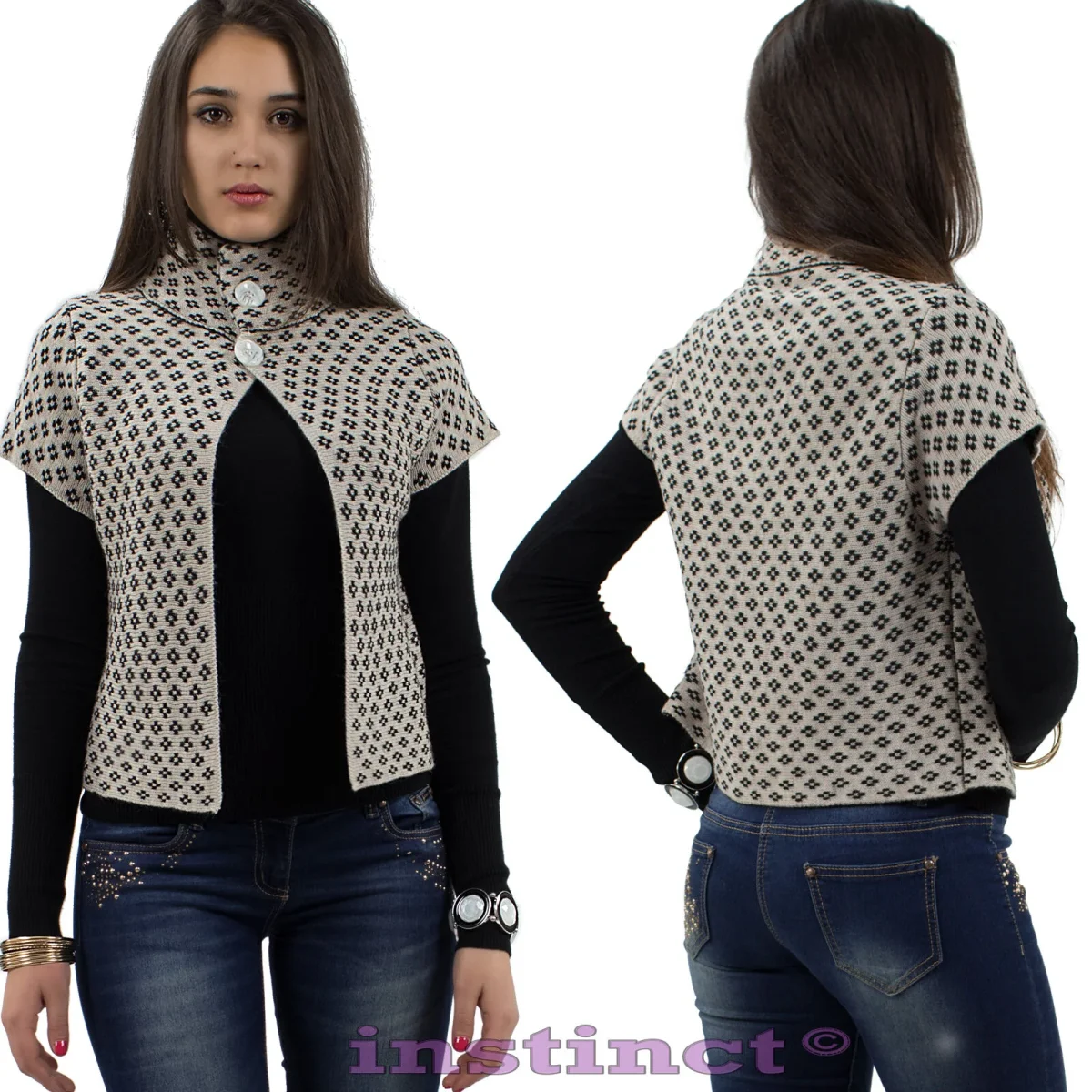 Poncho , coprispalle corto a collo alto disponibile in vari colori , bottoni frontali e decorazione geometrica. Sexy, fashion, trendy !!! Materiale: 60% acrilico 20% lana 20% mohair Taglia unica S/M
