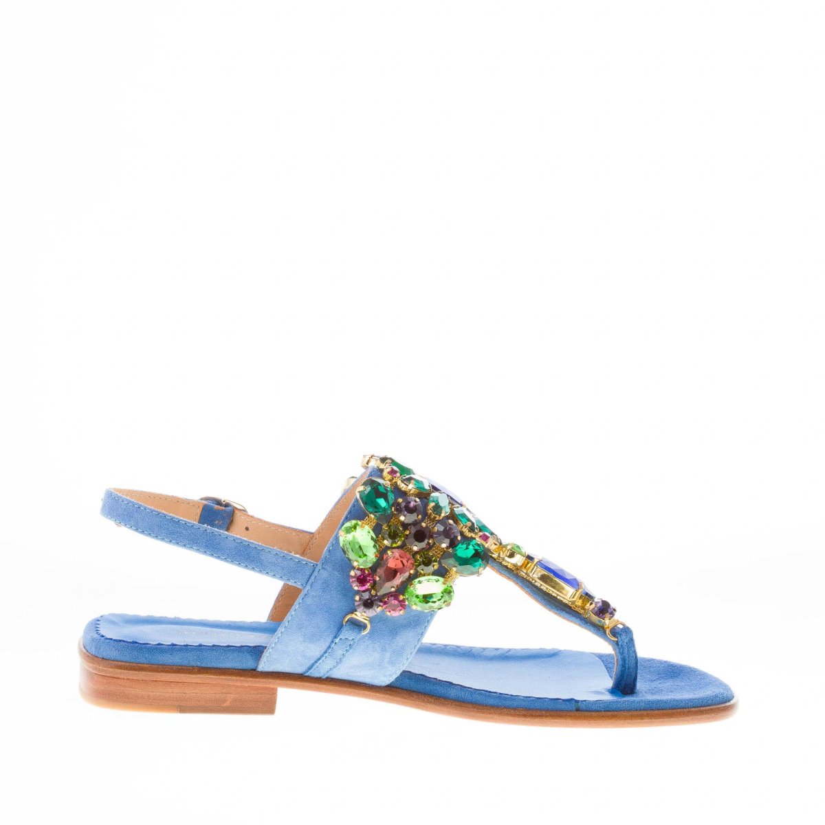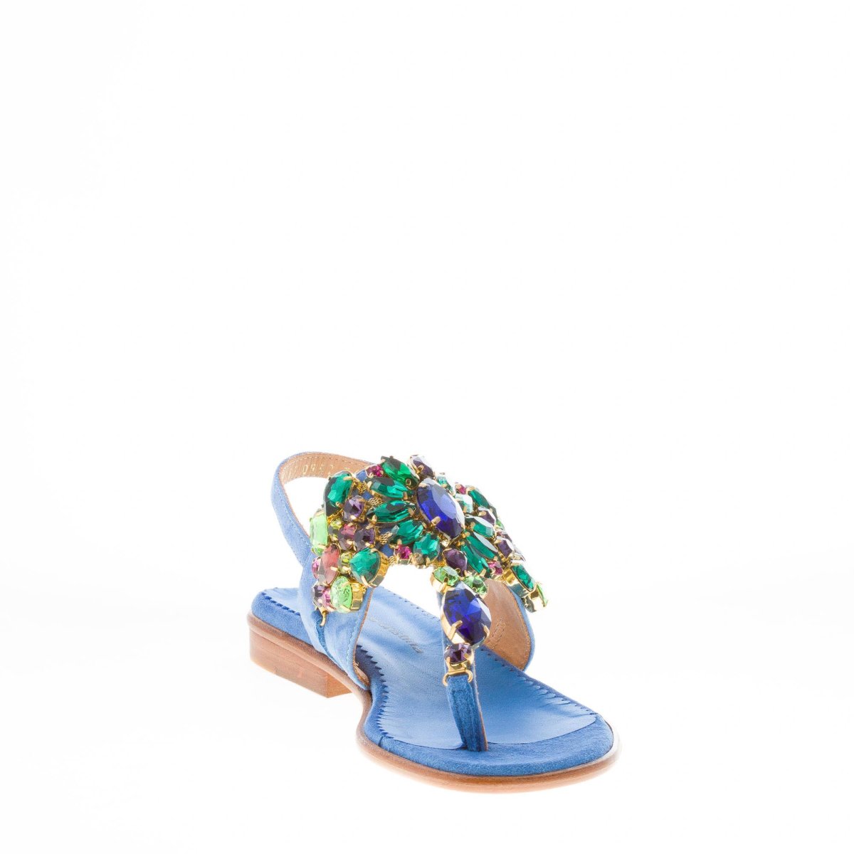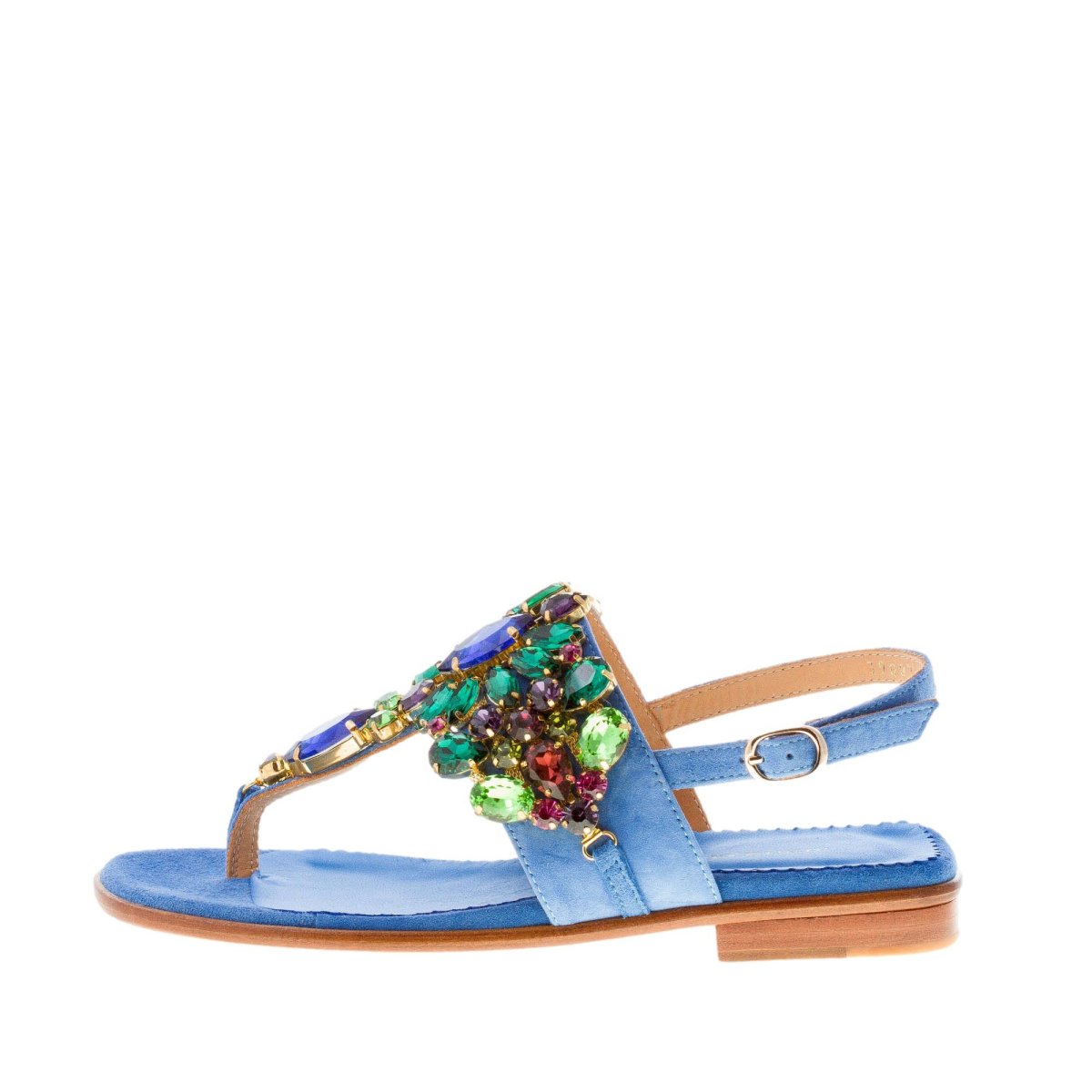 Blue cobalt suede thong sandal with a front maxi jewel made with multicolored rhinestones. Slingback strap closure with adjustable golden metal buckle. Leather sole. Heel 2,5 cm