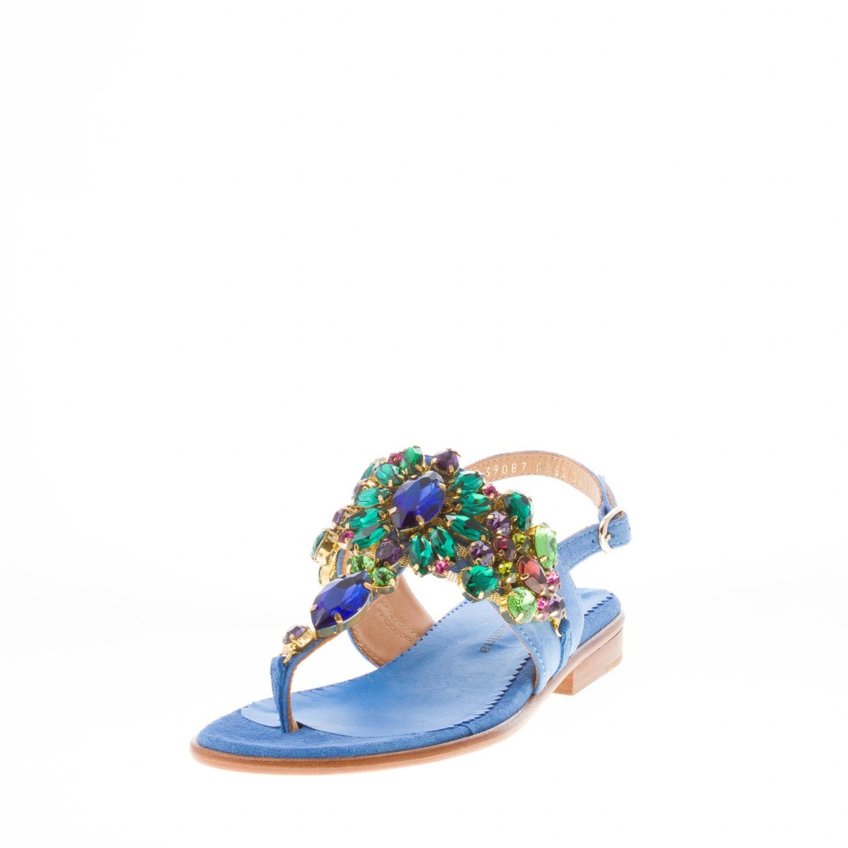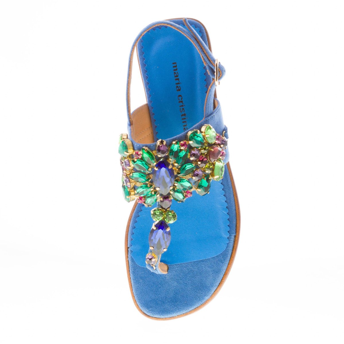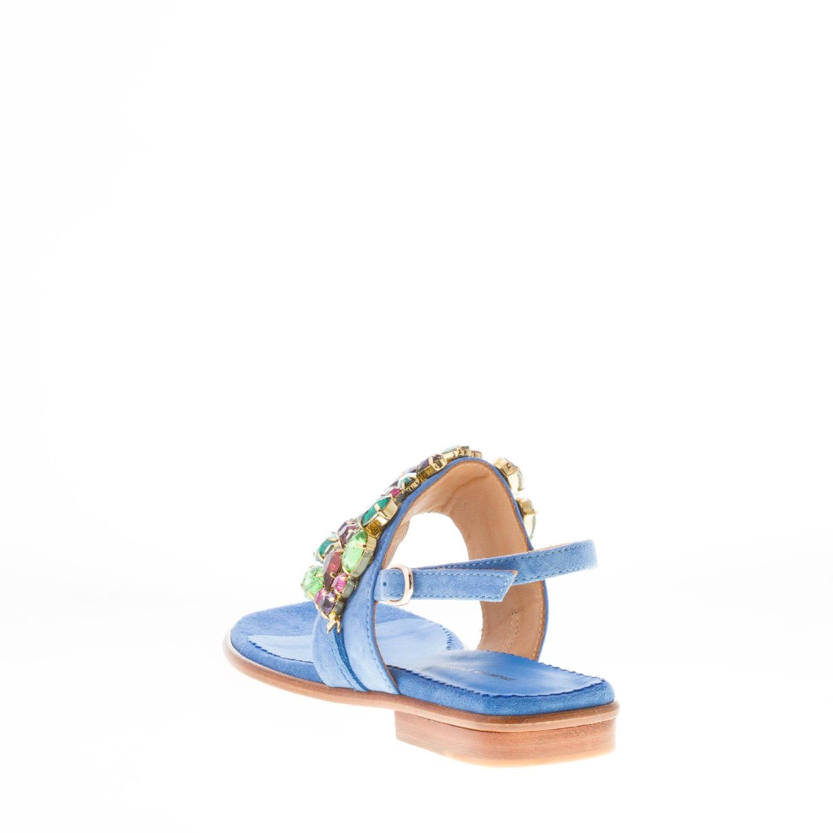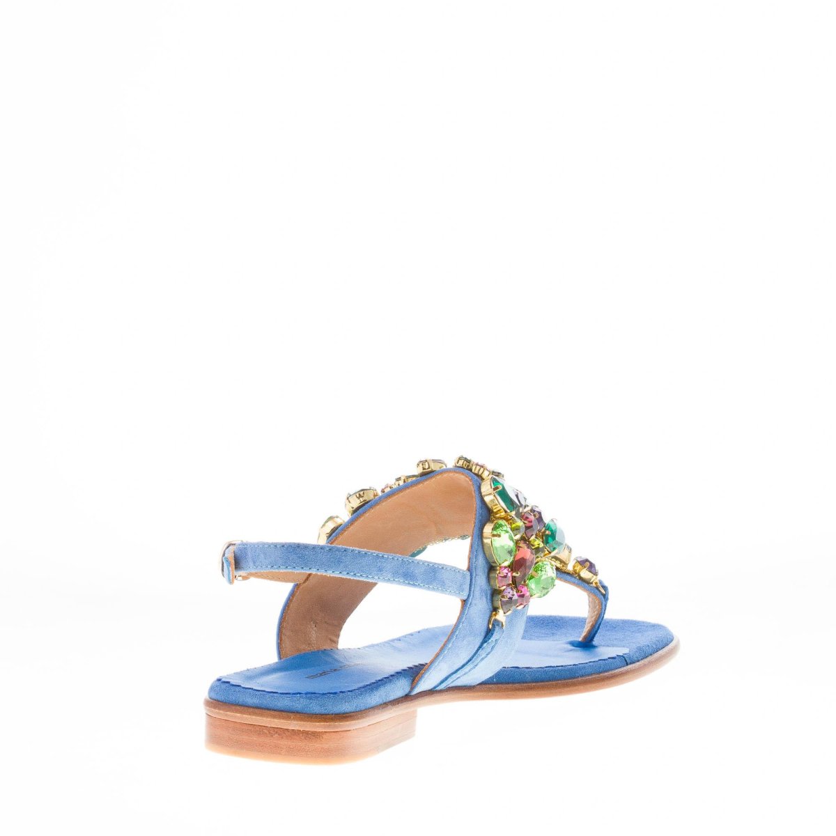 Blue cobalt suede thong sandal with a front maxi jewel made with multicolored rhinestones. Slingback strap closure with adjustable golden metal buckle. Leather sole. Heel 2,5 cm