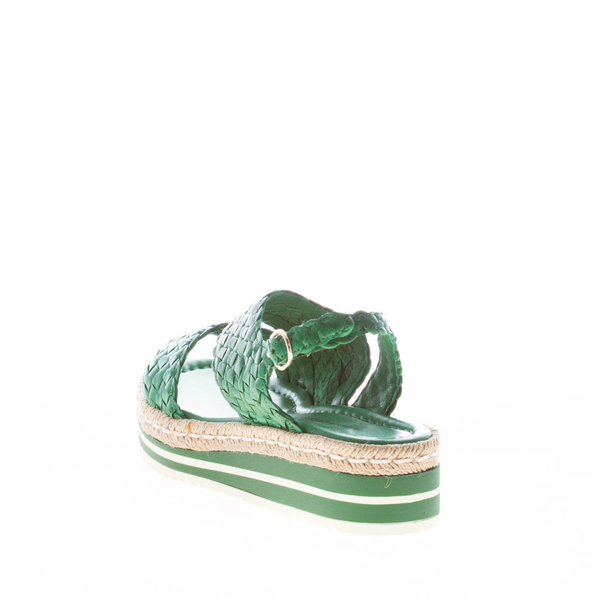 Sandalo platform Milan realizzato in pelle intrecciata a mano verde con doppia fascia ondulata sul piede. Chiusura con cinturino al tallone e fibbia argento regolabile. Dettaglio in rafia naturale lungo tutto il bordo del platform. Platform di 3 cm. Suola in gomma. Zeppa multicolore di 4 cm