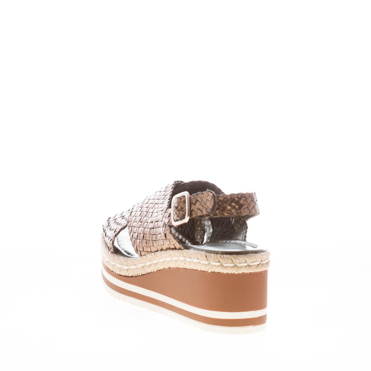 Hand-woven bronze color leather wedge sandal with two large crossed straps at toe. Slingback strap closure with metal buckle. Natural raffia trim along the external platform. Platform 3 cm. Rubber sole. Two-tones wedge 6 cm