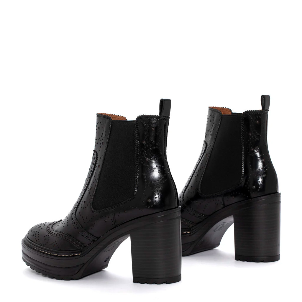Lo Stivaletto Olivia Nero Tacco di Pons Quintana รจ l’unione perfetta tra eleganza classica e design contemporaneo. Questo modello Chelsea boot rivisitato in pelle nera lucida, presenta la raffinata lavorazione brogue e un audace tacco alto e grosso. Ideale per chi cerca stile e comfort senza compromessi. Altezza tacco 9.5 cm. Plateau 4 cm. Suola in gomma effetto track. Fodera in pelle. Made in Spain.