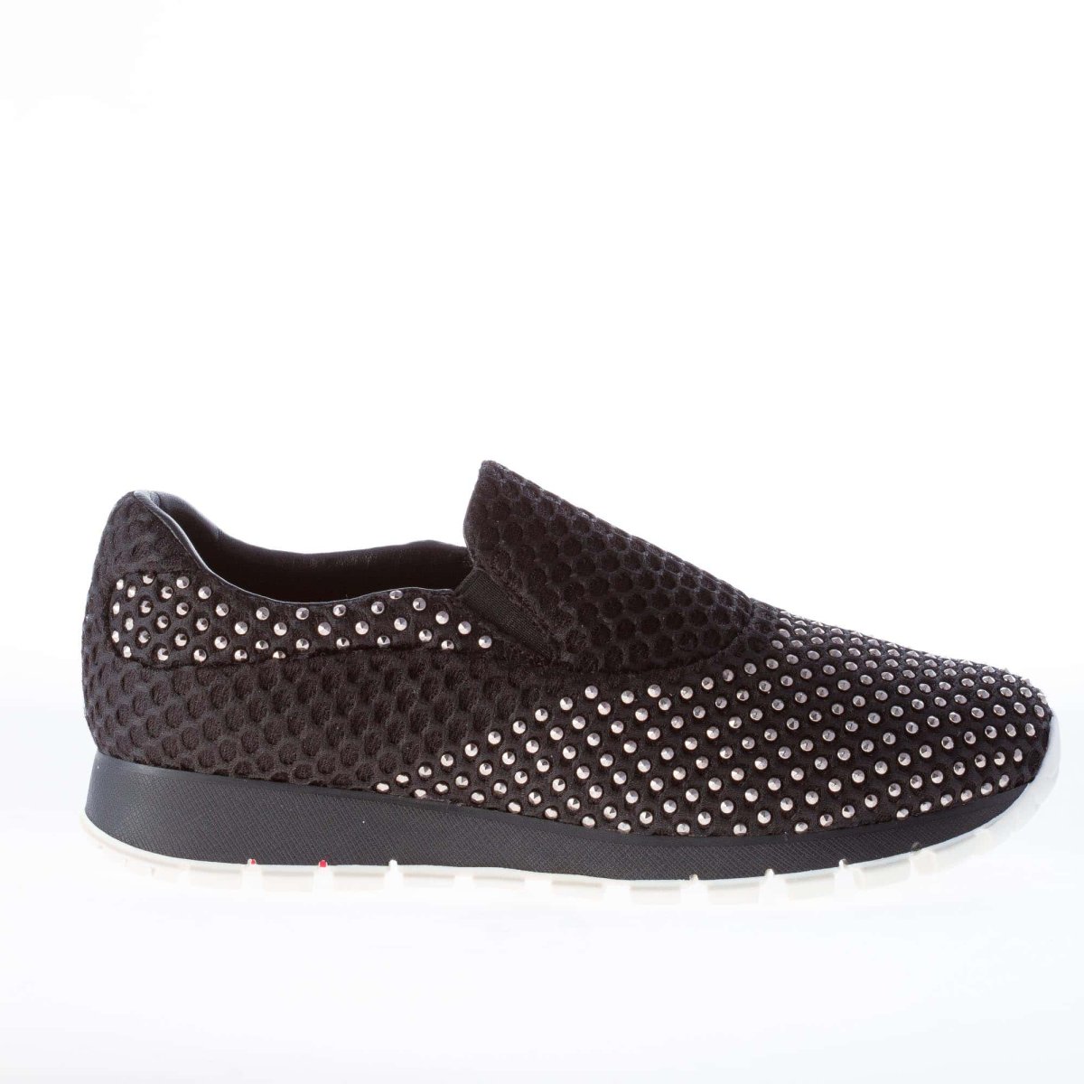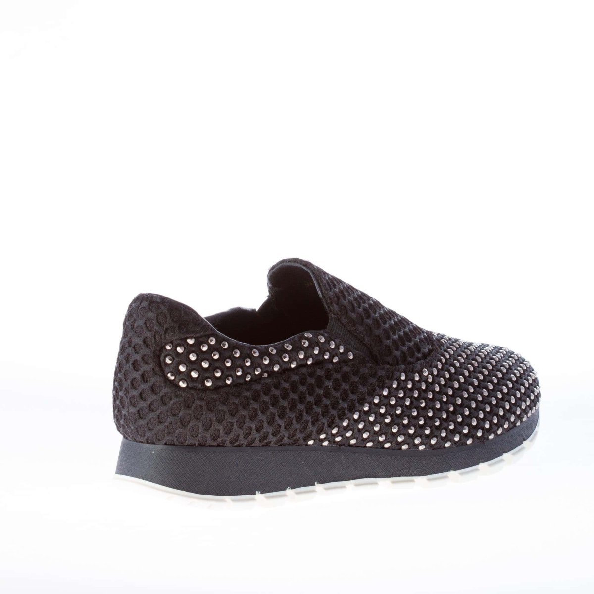 PRADA donna slip on BEE in tessuto tecnico a nido d’ape NERO con borchie