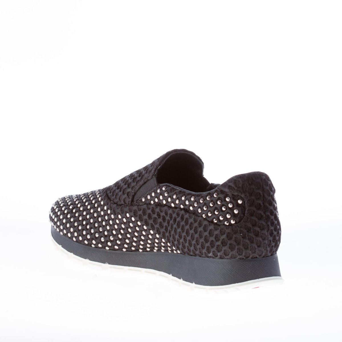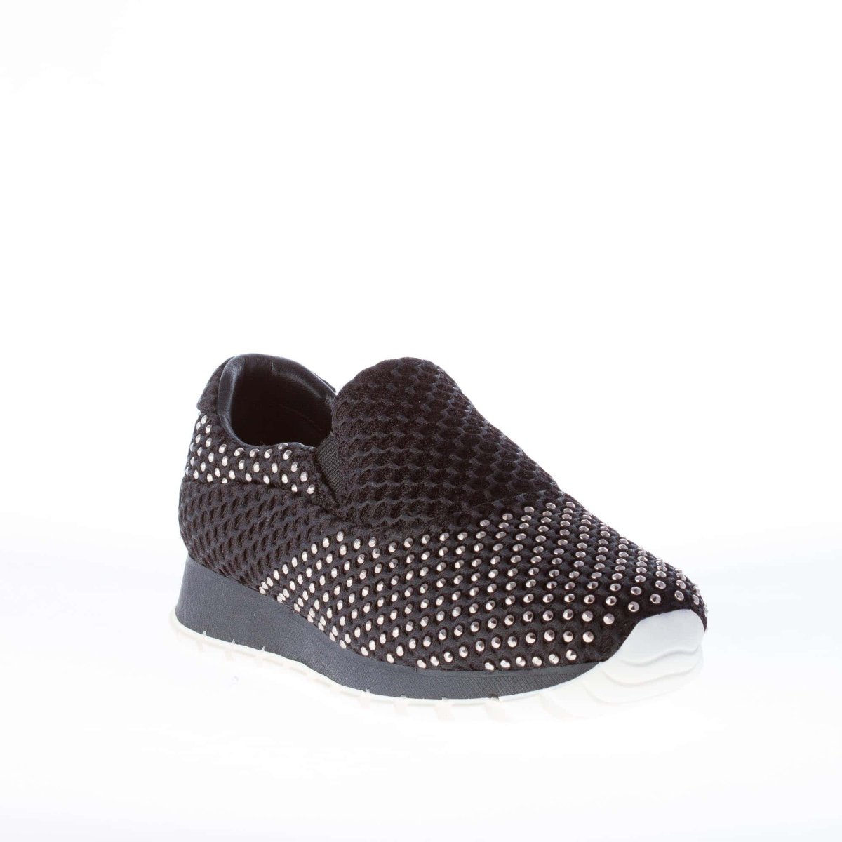 Slip on Bee running in tessuto tecnico nero con lavorazione a nido d’ape ed abbellimento con borchie in metallo argento. Inserti elastici laterali. Suola in gomma