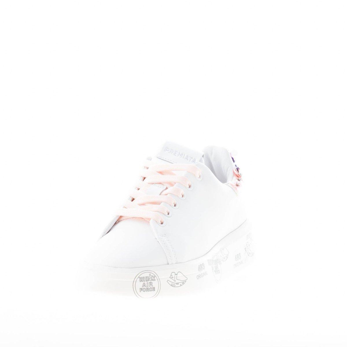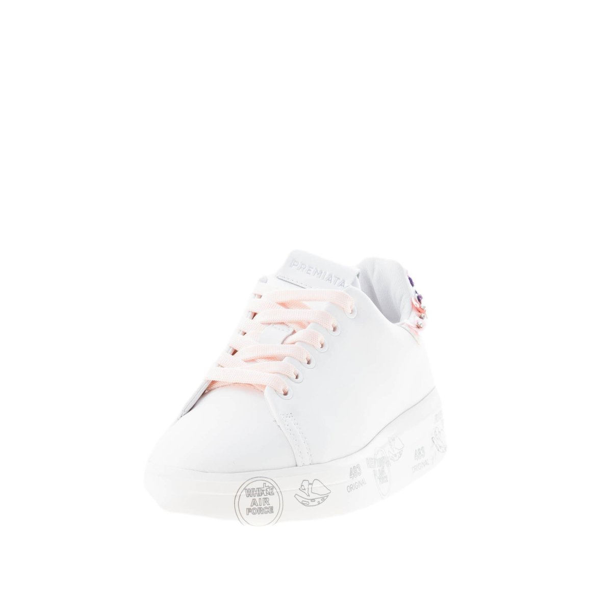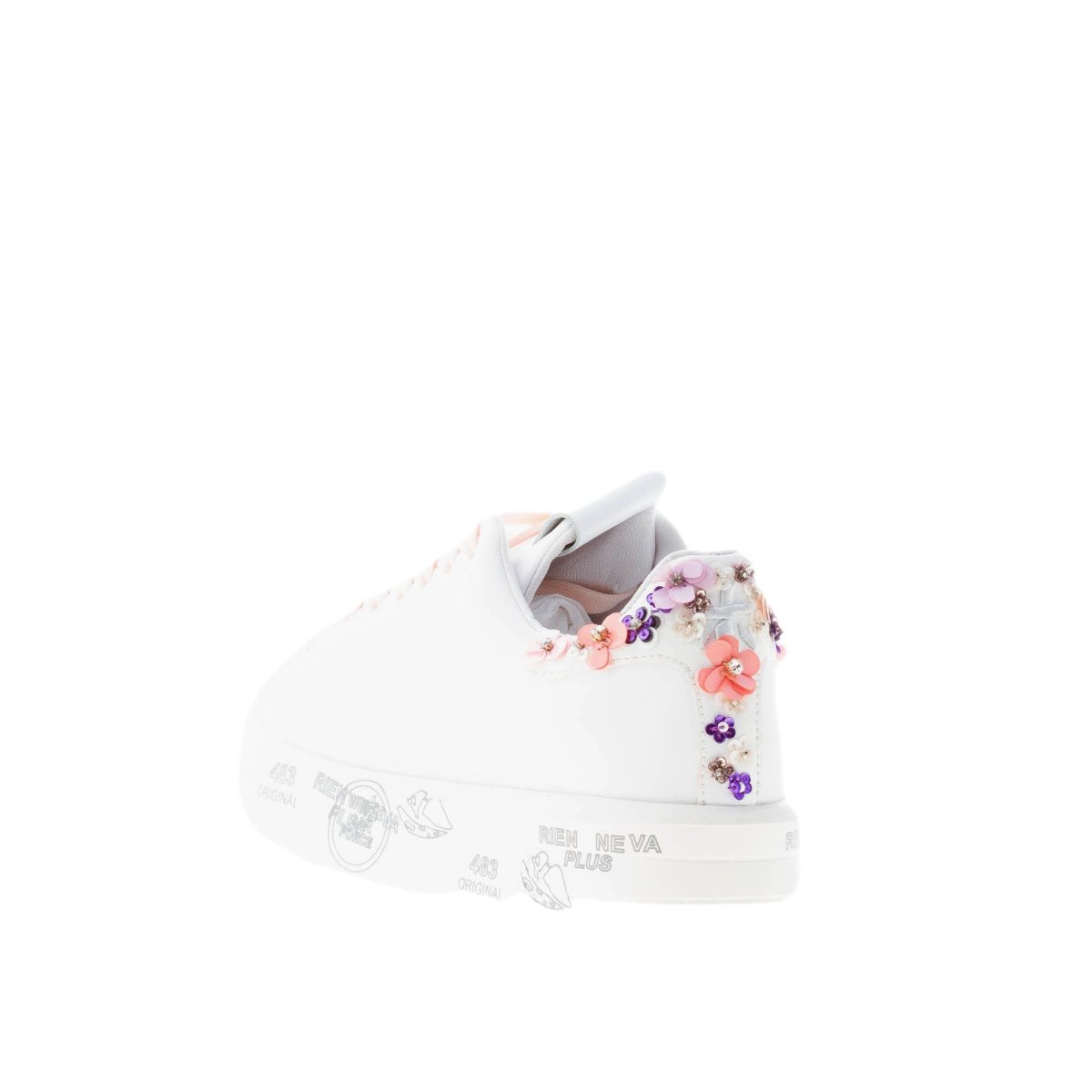 Sneaker Premiata BELLE 6709 realizzata in morbida pelle bianca con talloncino decorato da ricami e applicazioni floreali multicolore su tonalitร di rosa e viola. Suola a cassetta platform bianca di 3,5 cm in micro ultra-leggera con stampe graffiti