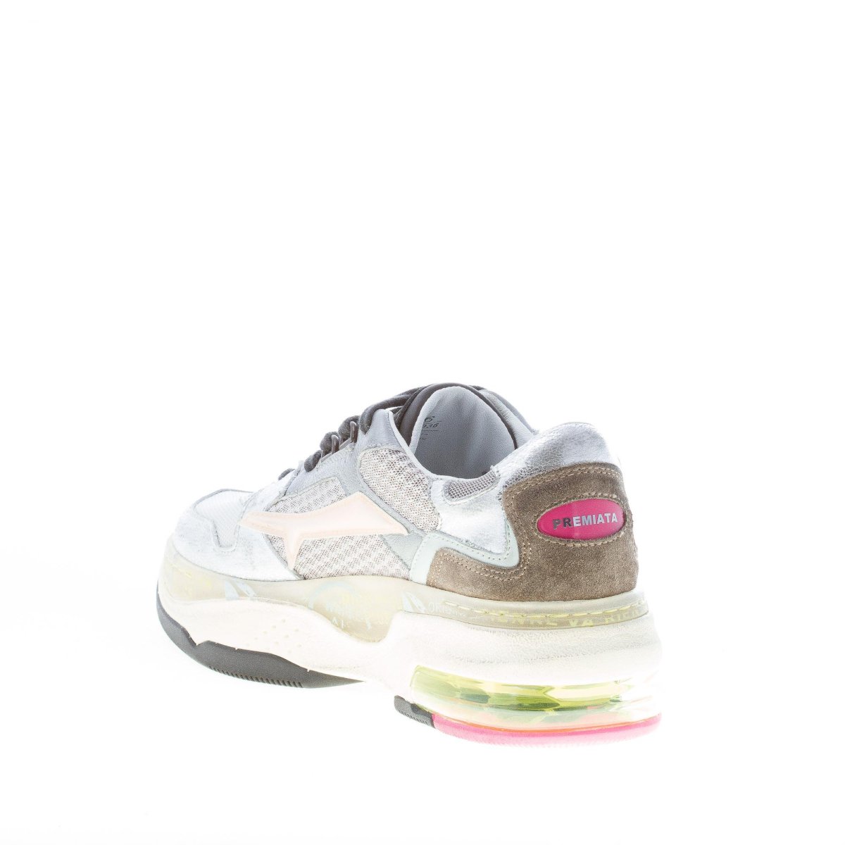 Draked 036 sneaker featuring a mix of silver high-tech fabric and leather with multicolor suede and leather details. Internal footbed 2,4 cm. Raised rubber sole 4 cm with the typical prints of the brand and a built-in air cushion. Premiata Sizey Crew keyring included in the box