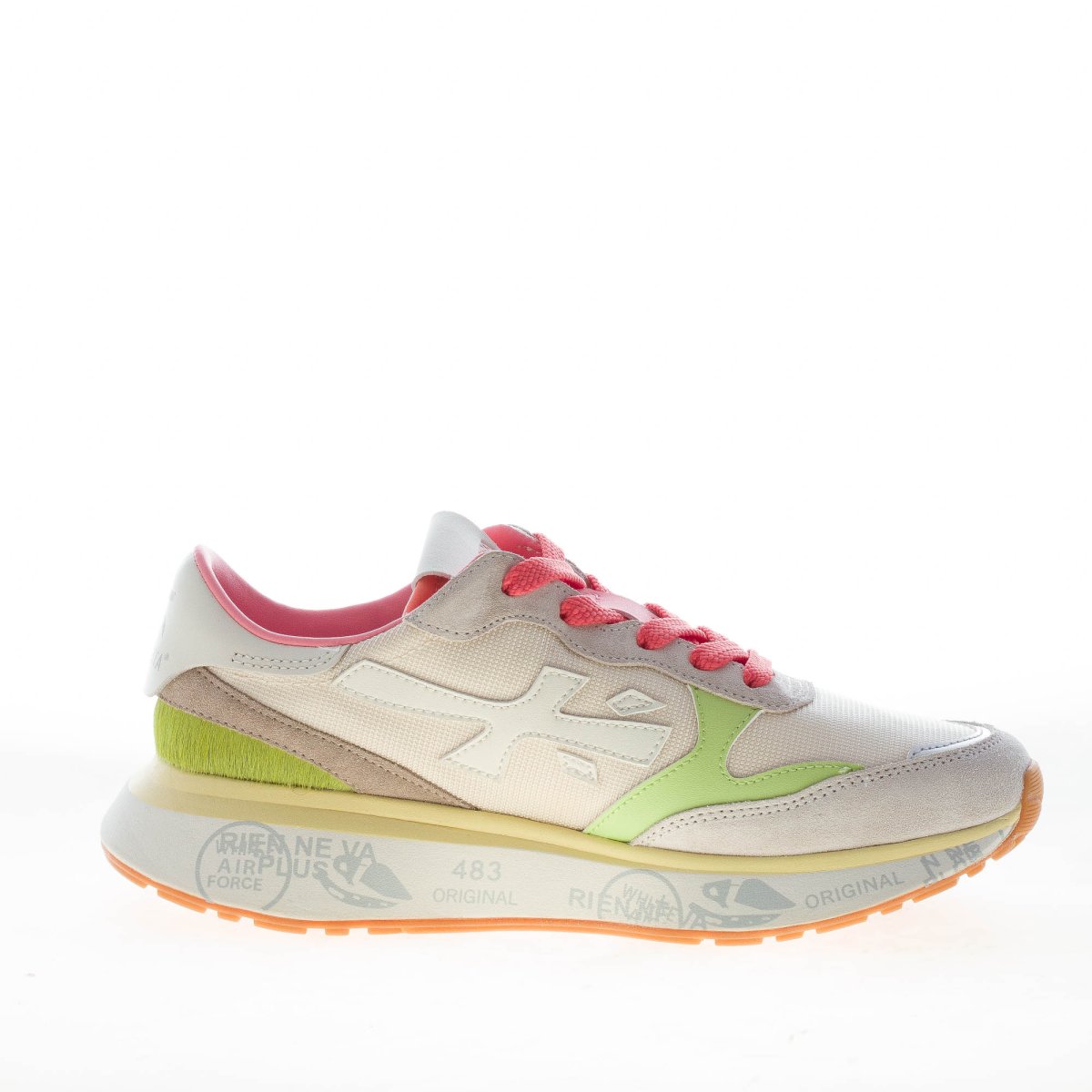 Cream tone tech fabric and grey suede Lauryn 7481 sneaker with a pony green detail at back. White leather logo at side. Internal removable footbed 1 cm. Lightweight 4,5 cm rubber sole with the typical prints of the brand