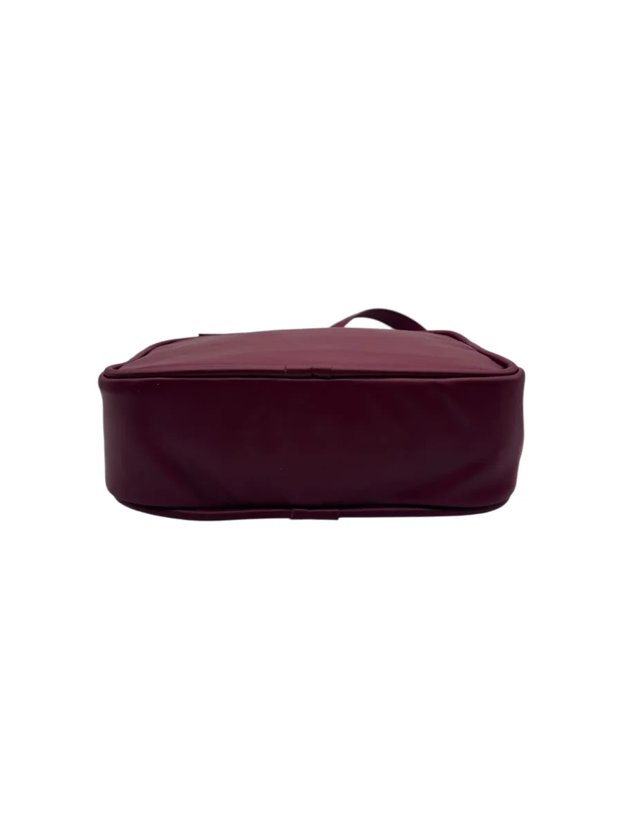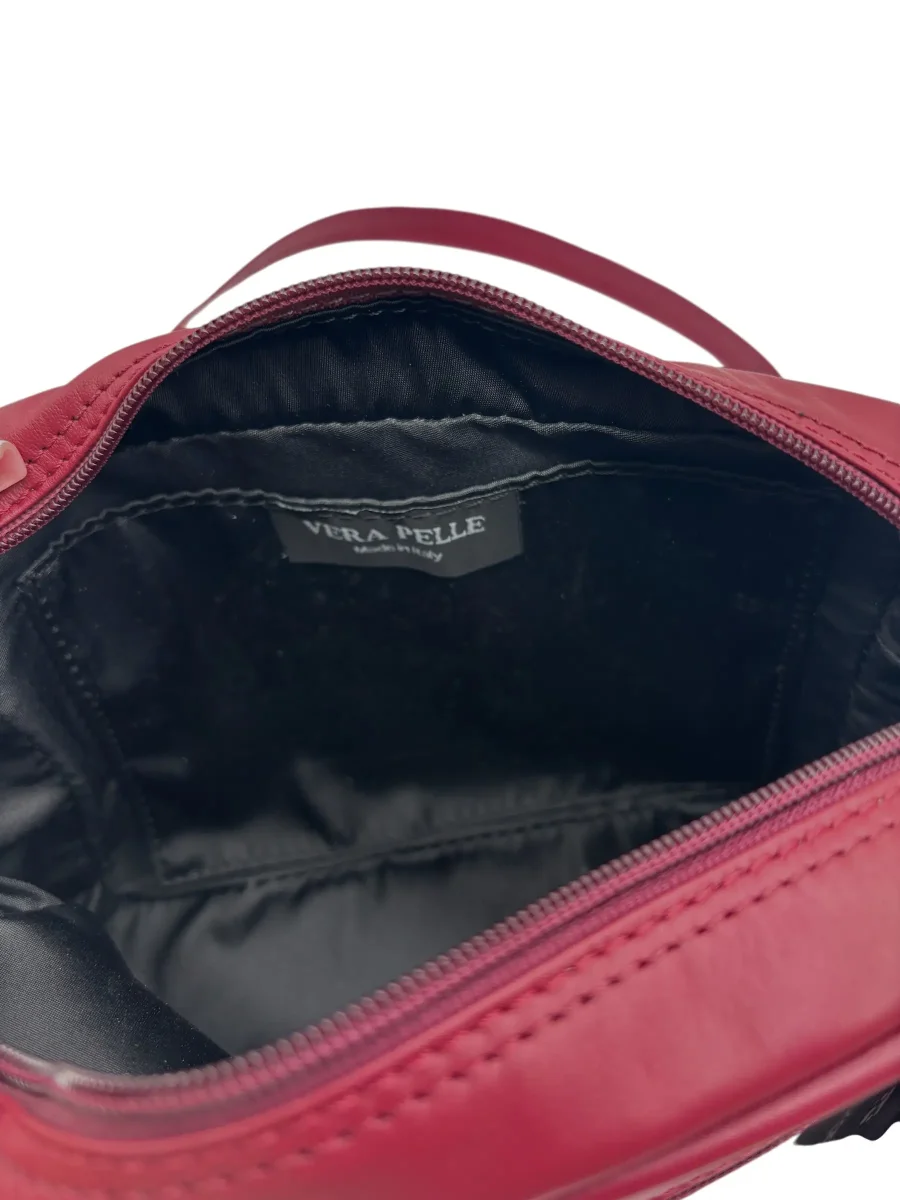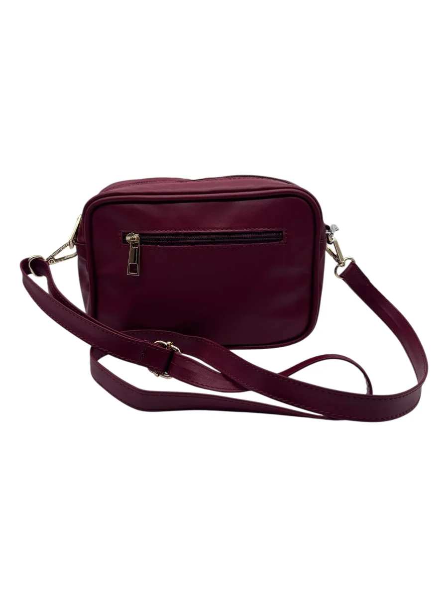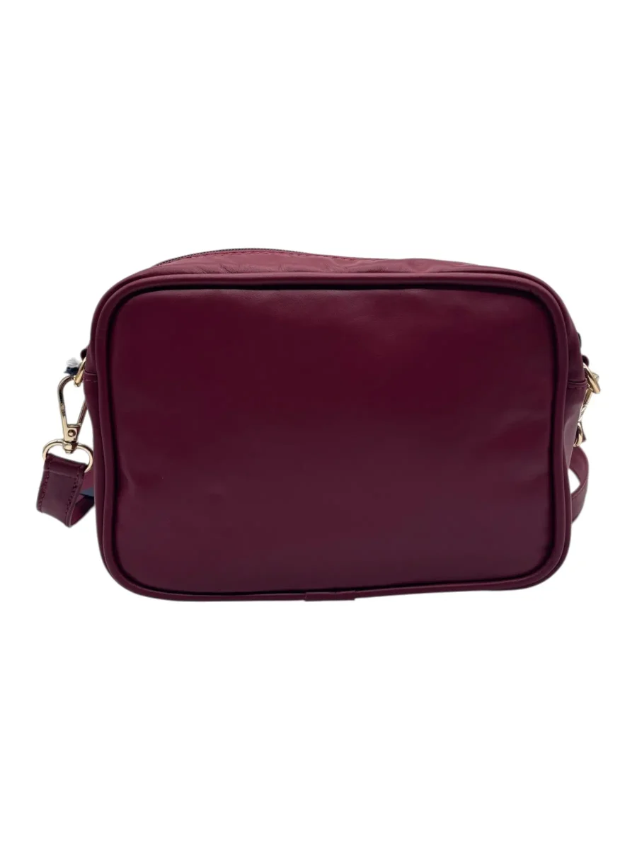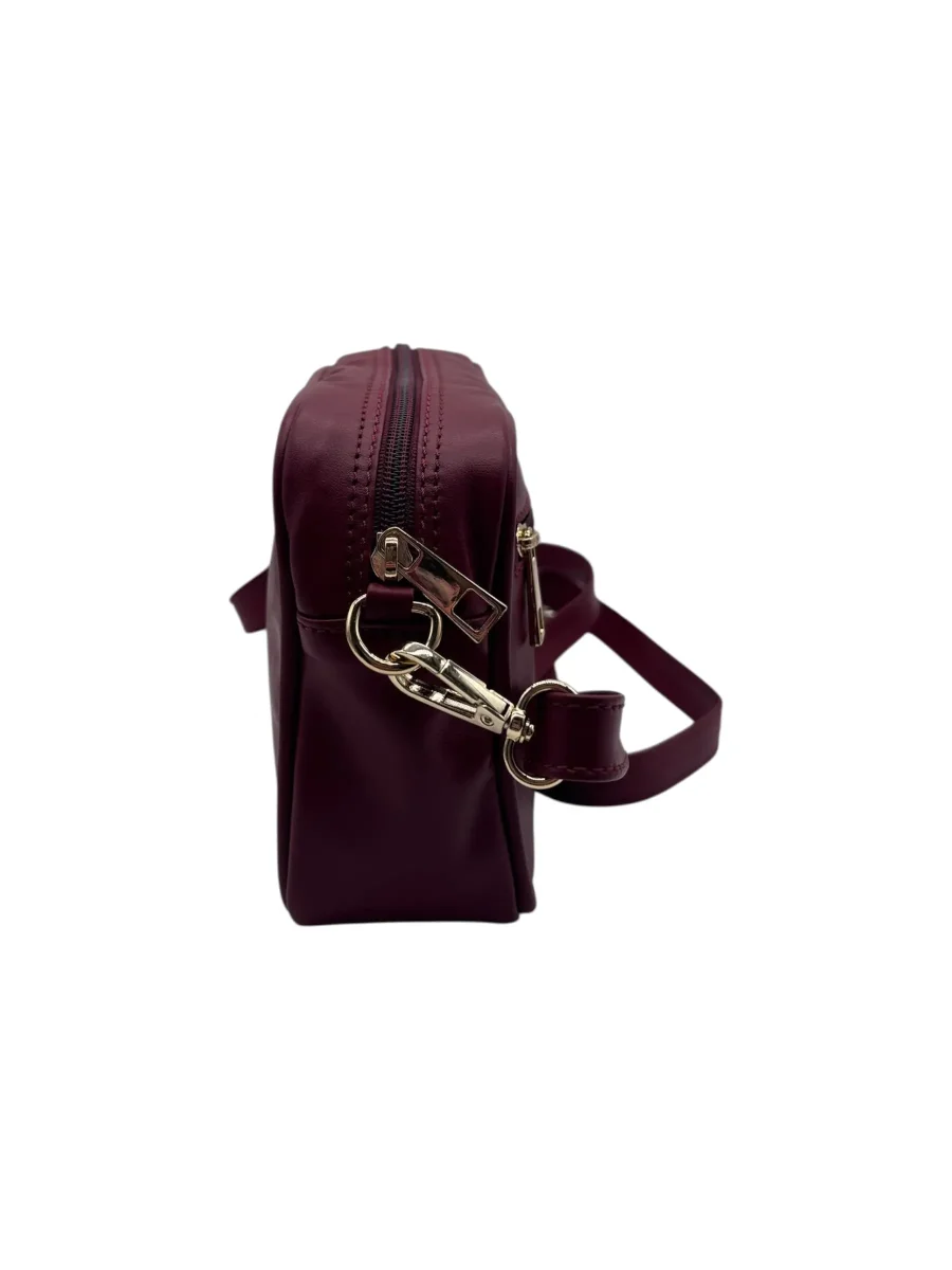 Borsa a tracolla realizzata in pelle bordeaux. Chiusura a zip in metallo dorato. Tracolla in pelle coordinata, removibile e regolabile. Comoda tasca posteriore a filo con chiusura a zip. Made in Italy. Misure: Altezza 15 cm, Larghezza 21 cm, Profondità 7 cm.
