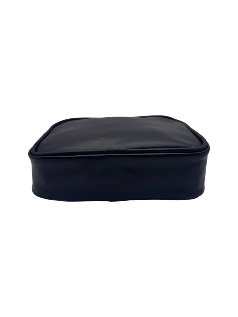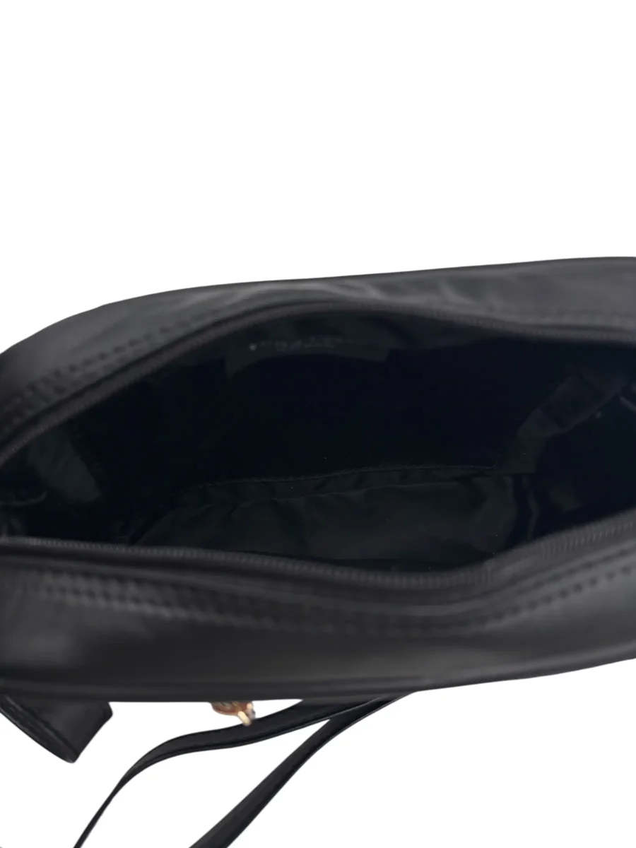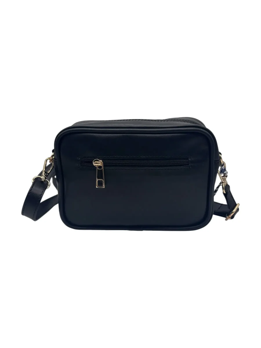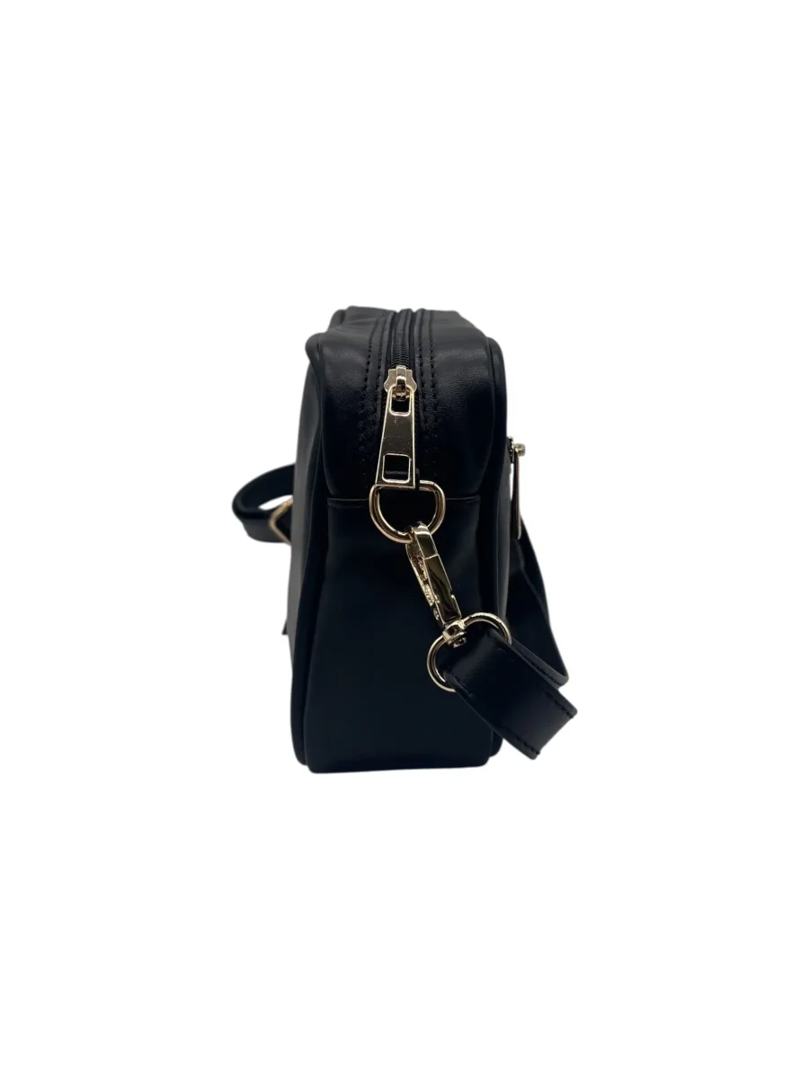 Borsa a tracolla realizzata in pelle nera. Chiusura a zip in metallo dorato. Tracolla in pelle coordinata, removibile e regolabile. Comoda tasca posteriore a filo con chiusura a zip. Made in Italy. Misure: Altezza 15 cm, Larghezza 21 cm, Profondità 7 cm.