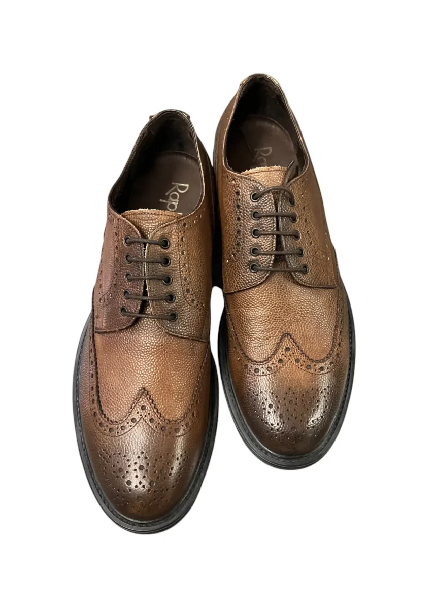 Scarpe stringate robuste in pelle martellata marrone con lacci. Suola cucita. Calzata regolare per la numerazione indicata. Spediti in scatola originale. Marca: Raphael. Prezzo retail 225,00€