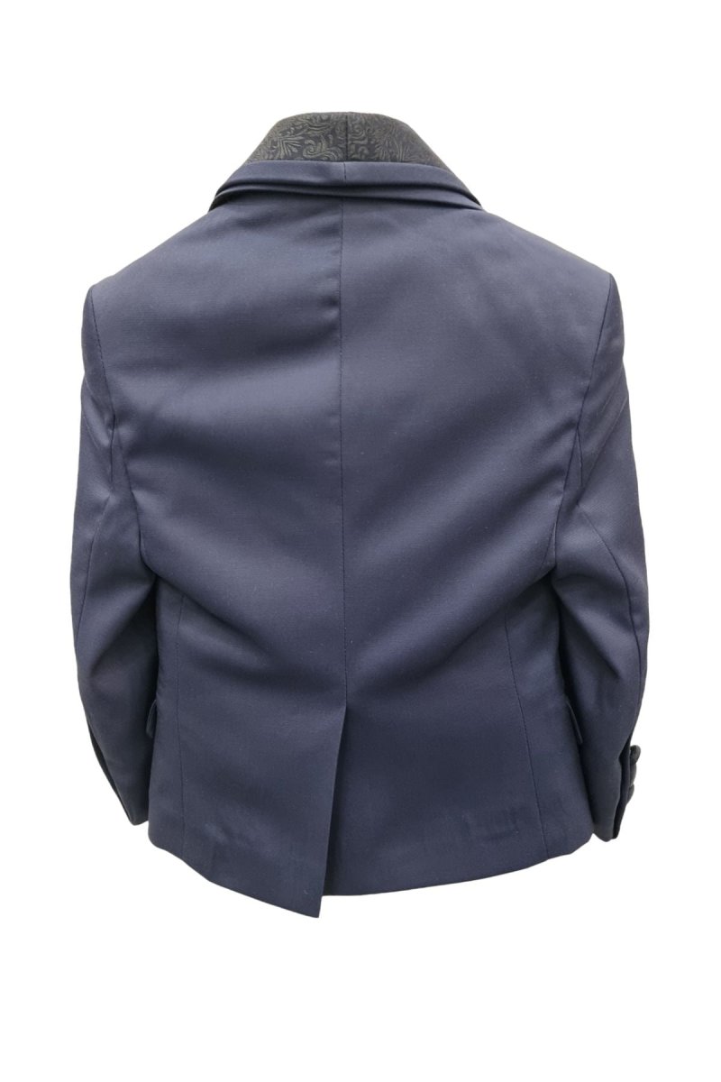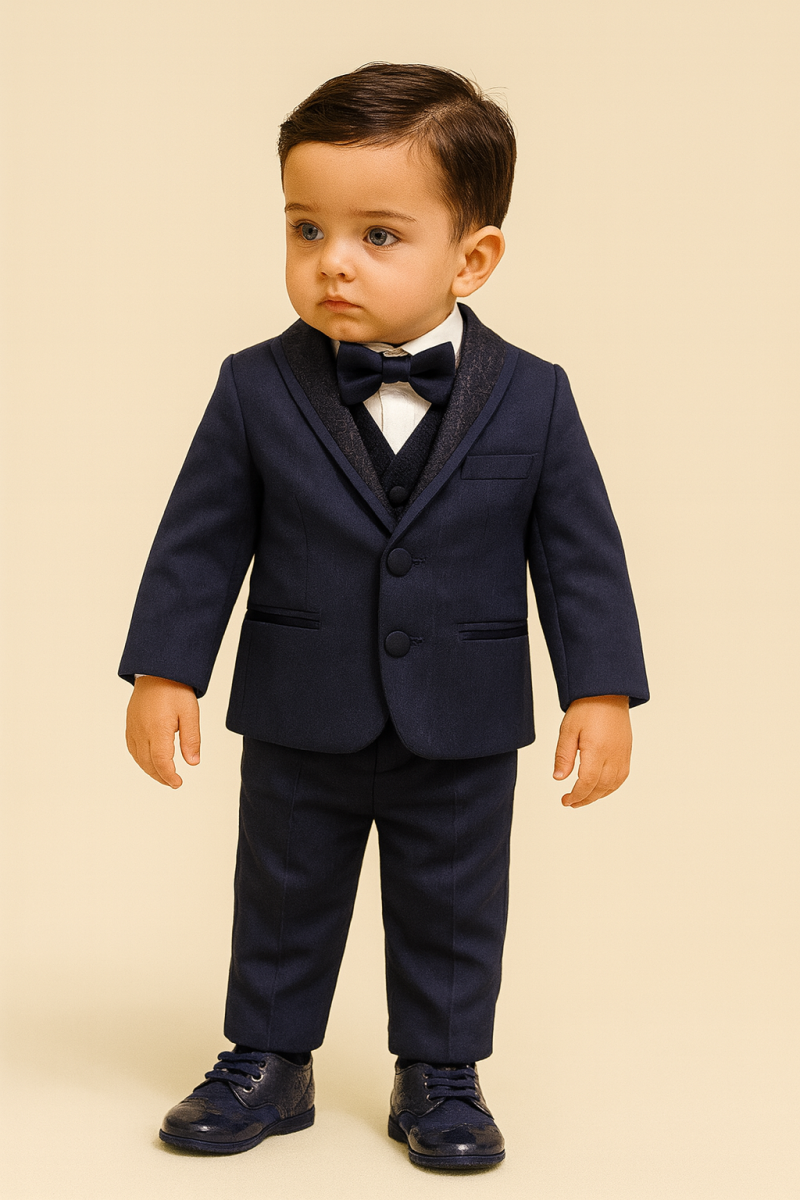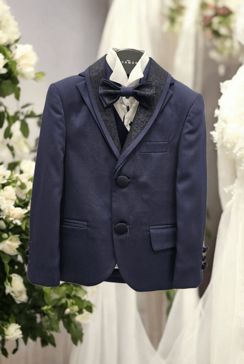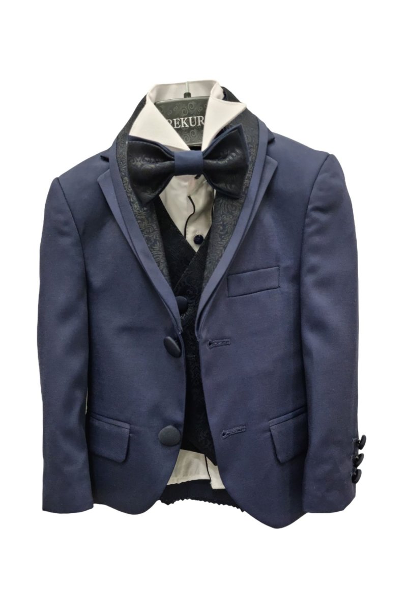 Completo 5 pezzi composto da: Giacca -Gilet โ Camicia โ Papillon โ Pantalone โ Vestibilitร : Slim โ Rever staccabile โ Gilet liscio โ Giacca microfantasia โ Bottoni particolari camicia e giacca