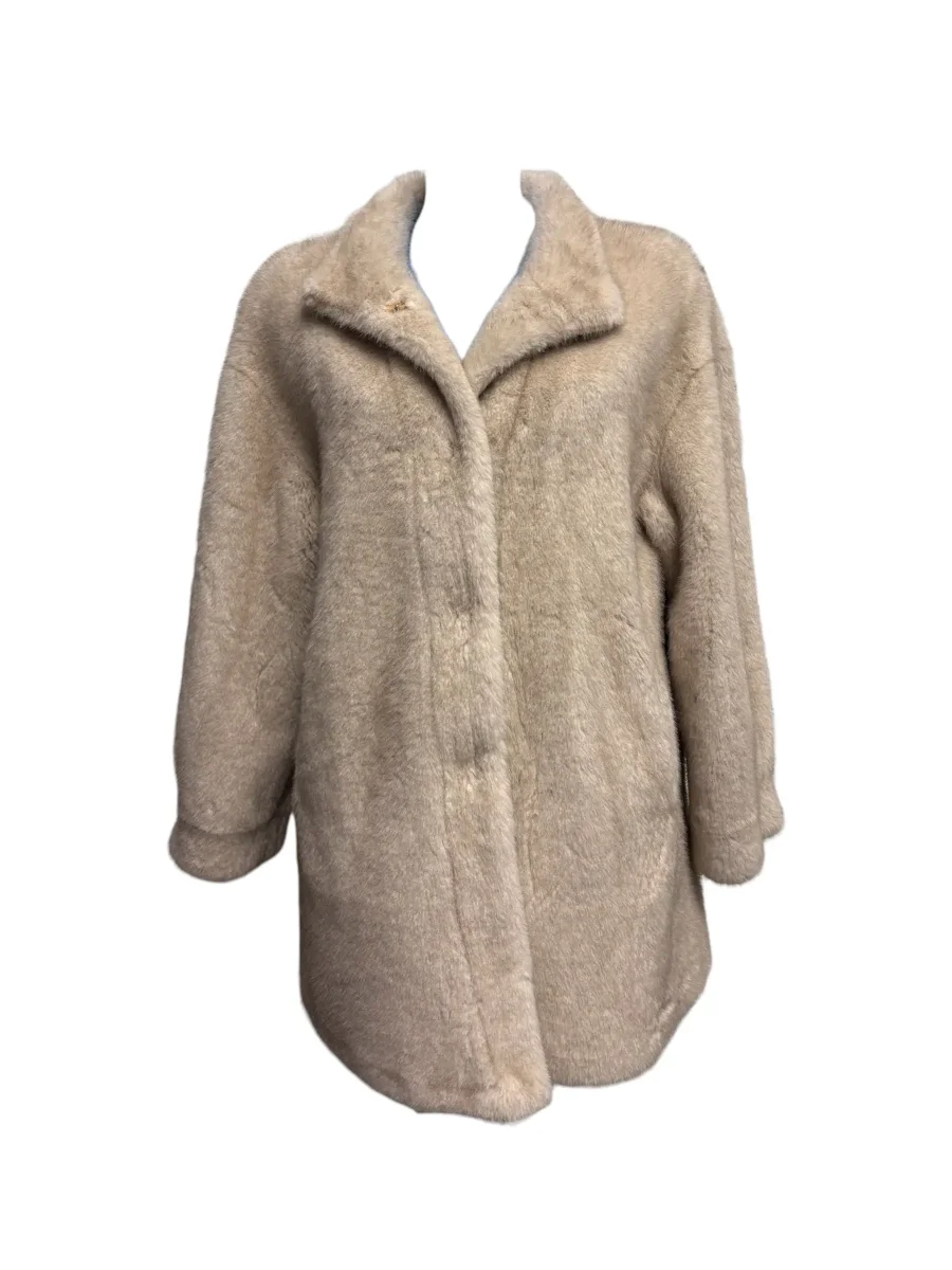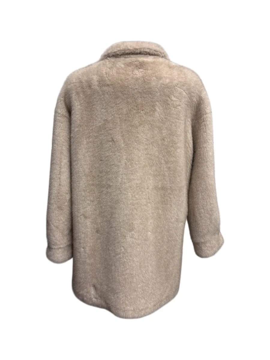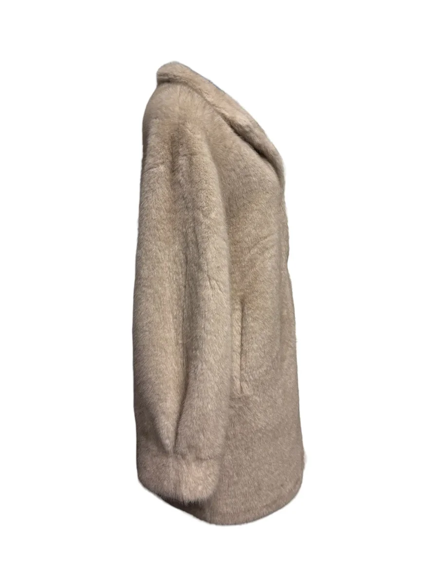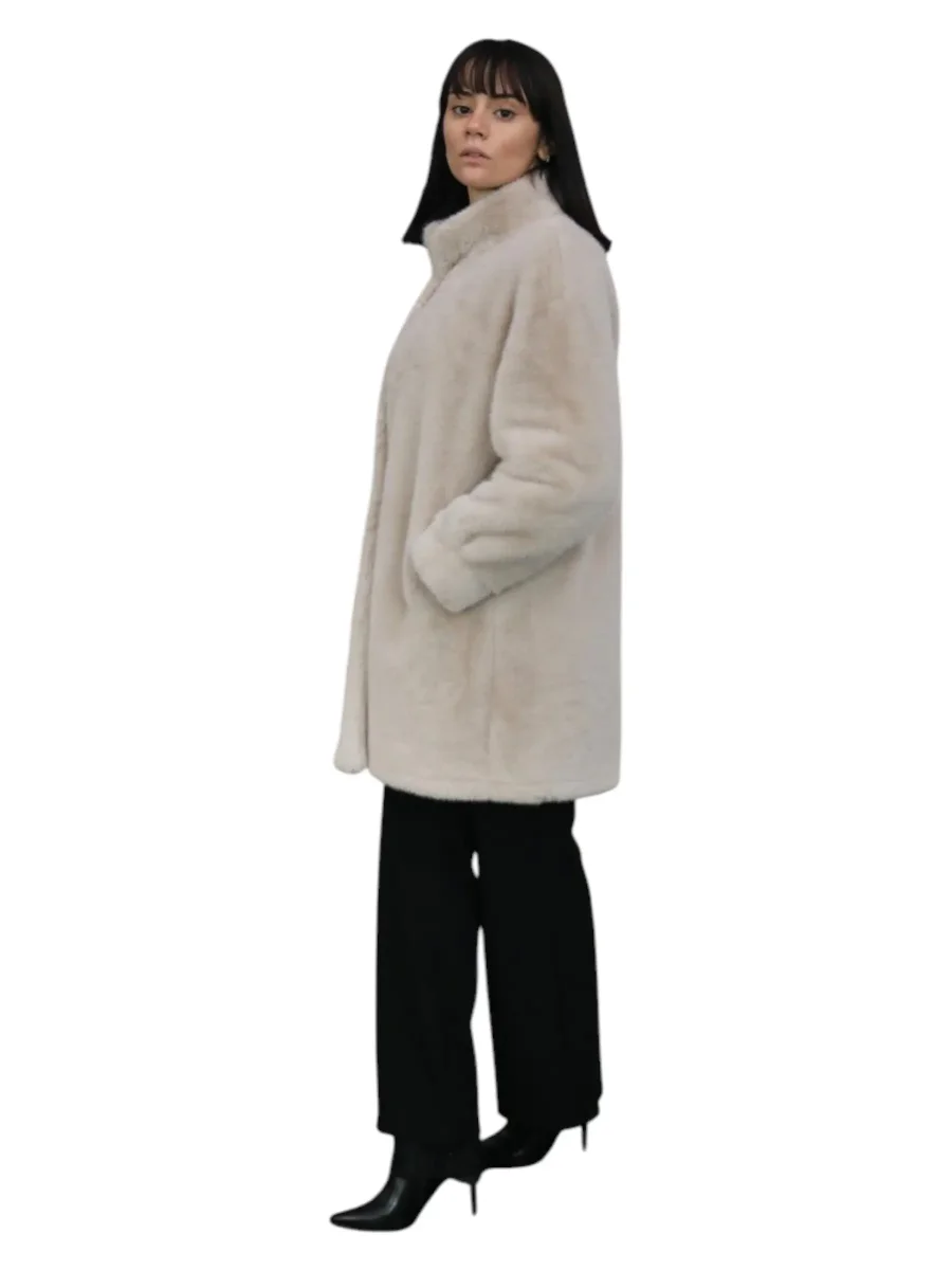 Pelliccia ecologica color panna, caratterizzata da un tessuto morbido al tatto. Ideale per serate eleganti o eventi formali, aggiunge un elemento di lusso all’abbigliamento quotidiano. Con chiusura frontale nascosta, con bottoni a pressione. Lunghezza sopra il ginocchio. Vestibilità dritta e confortevole.