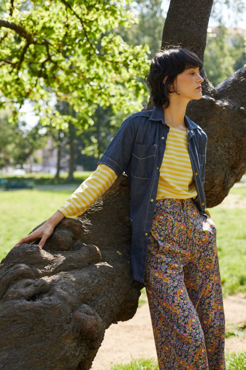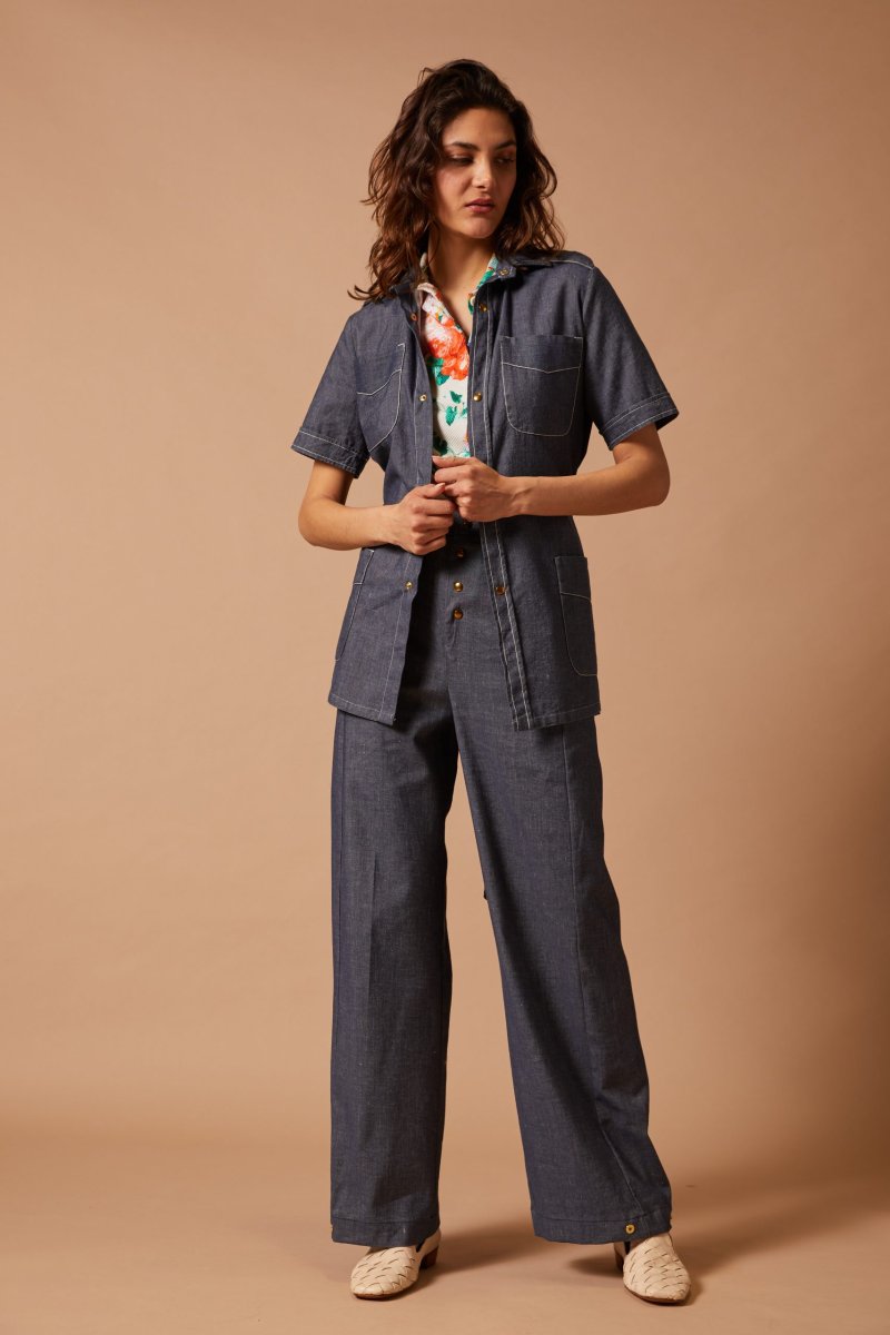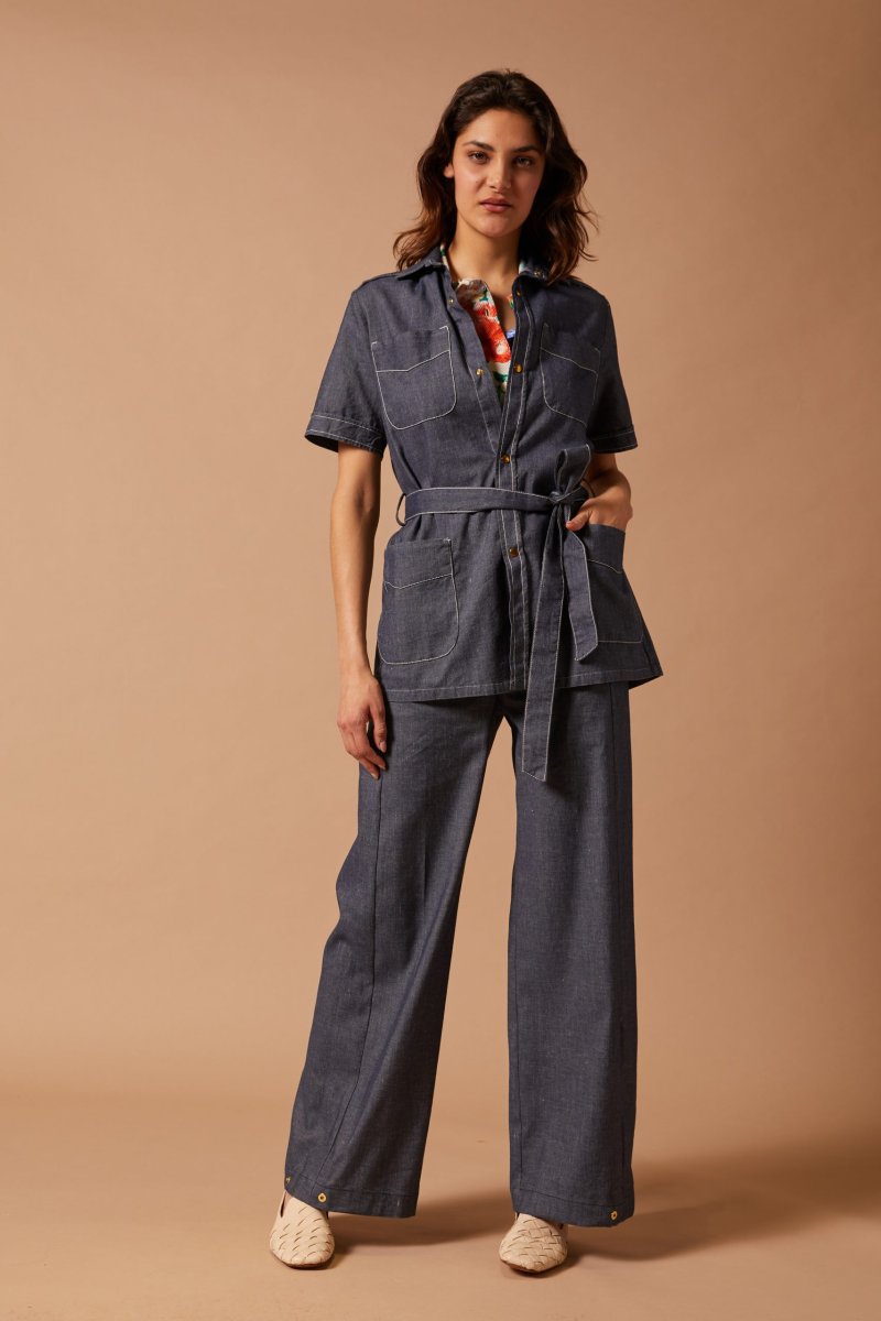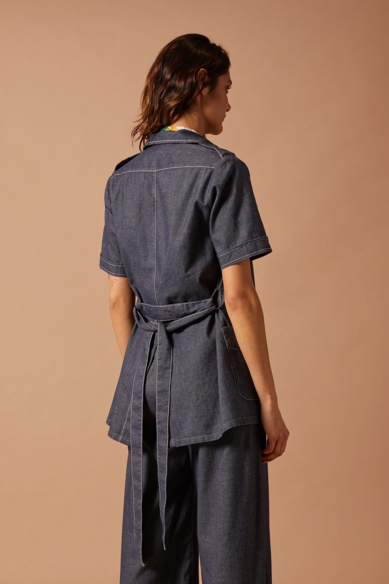 Sahariana Natalie a maniche corte di Carla Saibene con tasche applicate, bottoni a pressione,ย alto spacco sul retro,ย cintura e passanti nello stesso tessuto, impunture a contrasto che sottolineano i dettagli. Questa camicia in denim blu leggero puรฒ essere indossata a pelle come come camicia o come giacchina leggera sopra una polo colorata e con i pantaloni dello stesso tessuto. Vedi altre varianti 100% cotone Made in Italy Vestibilitร comoda: la modella รจ alta 179 cm e porta una taglia 40 Taglia italiana