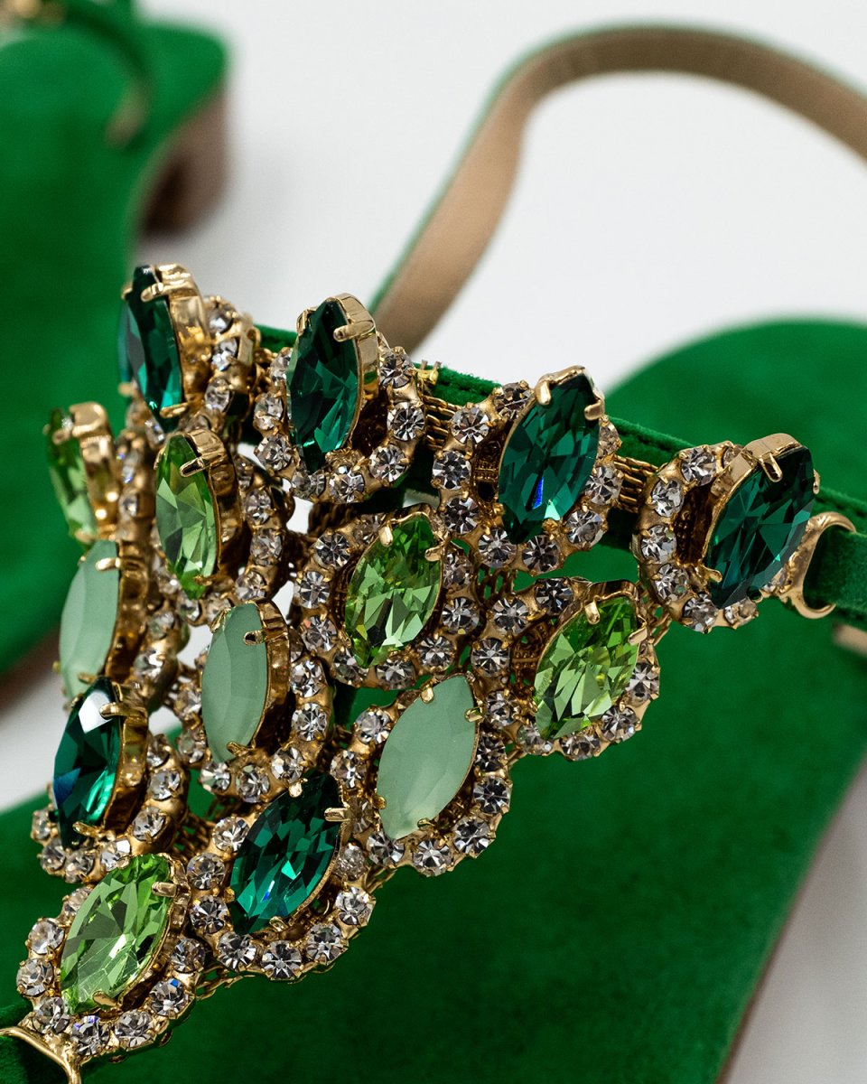 Il collo del piede รจ incorniciato dai cristalli swarowski nelle tonalitร del verde che formano un affinatissimo triangolo.