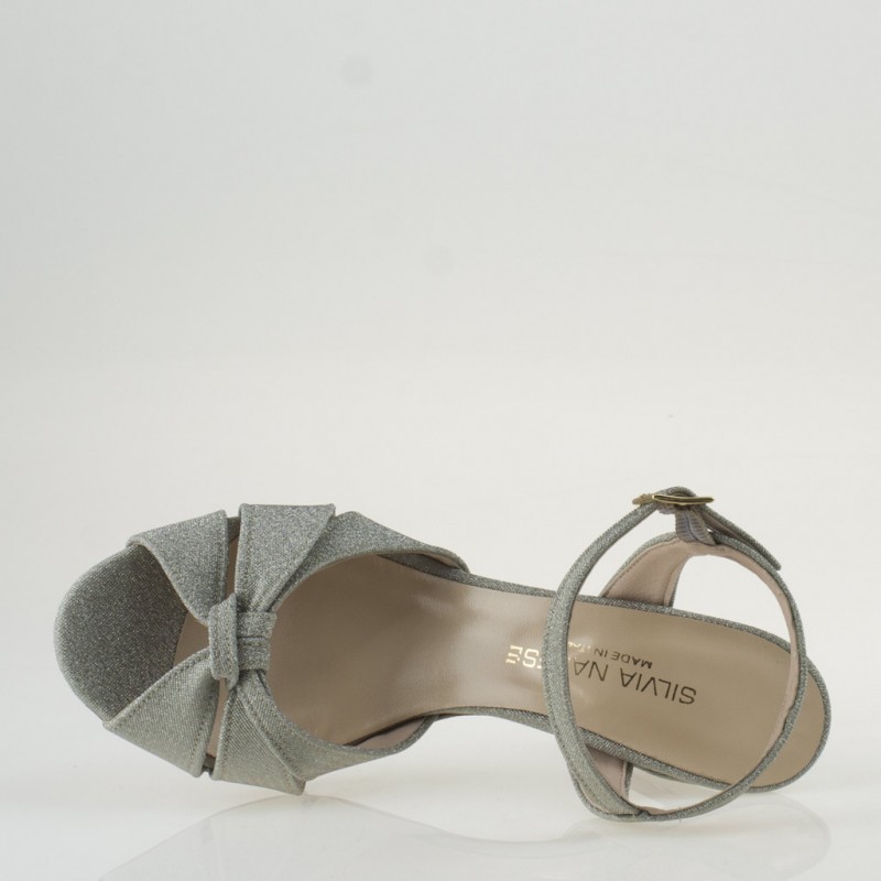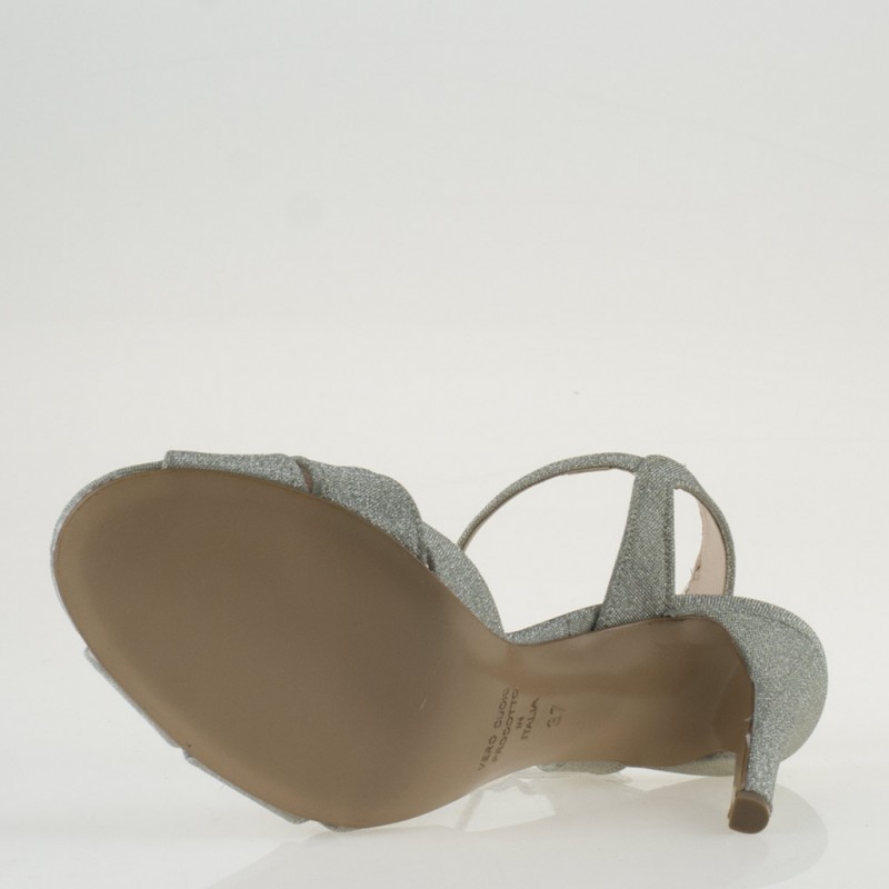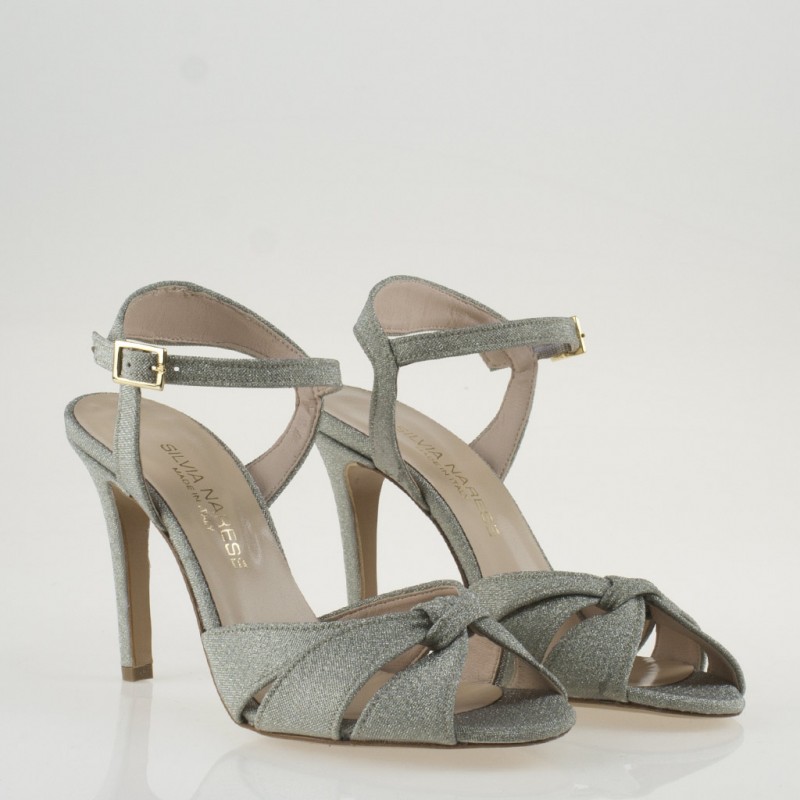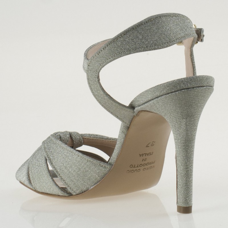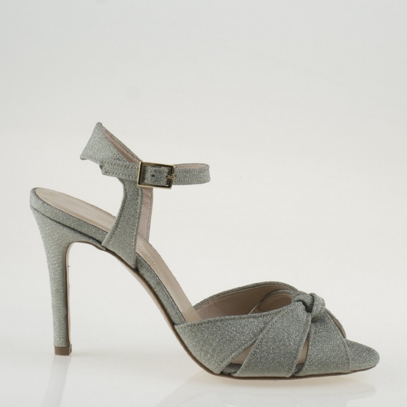 Sandalo in tessuto glitterato con cinturino regolabile sulย collo del piede. Altezza taccoย 9ย cm. Fodera in pelle. Suola in cuoio. Made in Italy.